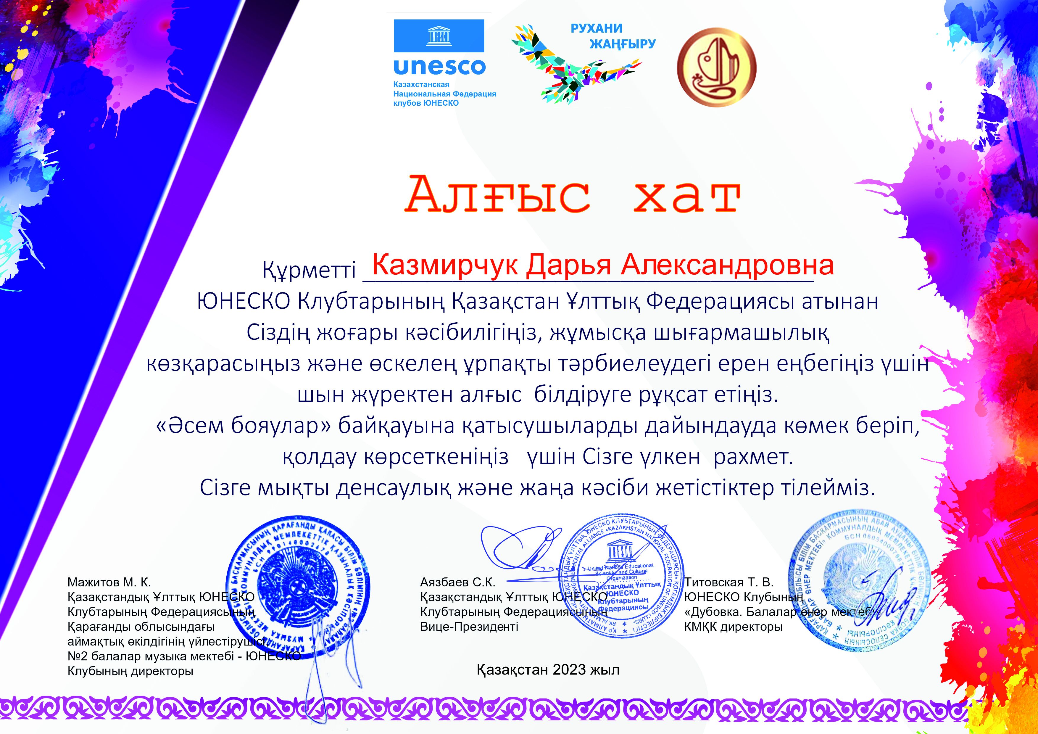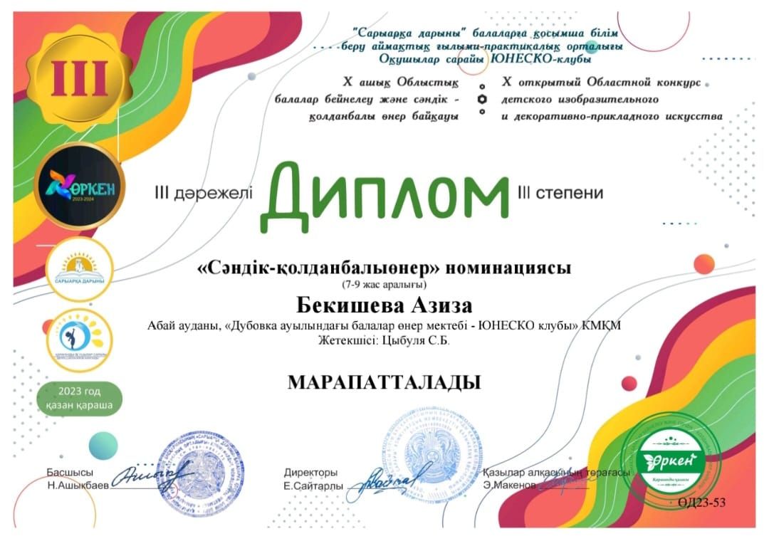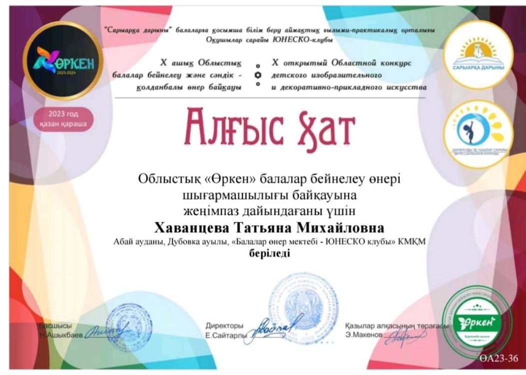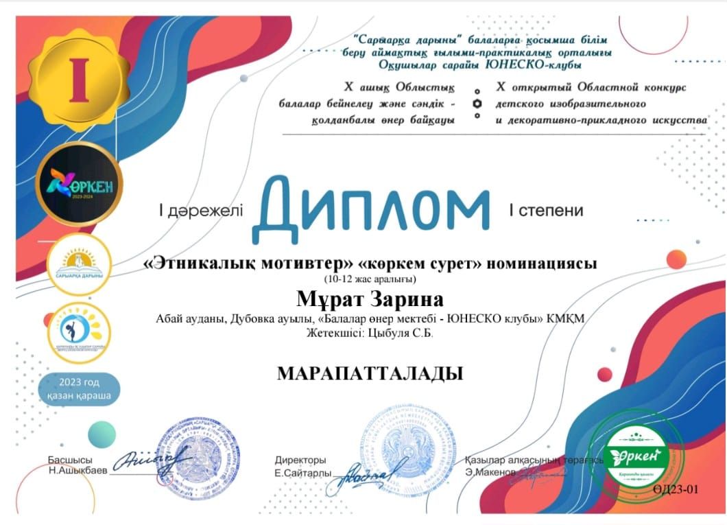 Дипломом 2 степени награждается Вишеревич Мария за победу Республиканского конкурса изобразительного творчества посвященного Дню Независимости Республики Казахстан "Жасасын, Тәуелсіз Қазақстан&…