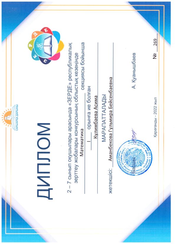 2. Кулимбаева Асима 6 «В» сынып оқушысы, I орын - жетекшісі –Аманбекова Гульмира Бейсенбаевна