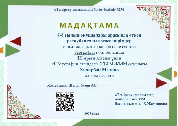 6.Хидирбай Мадияр 7-сынып оқушысы, география - 3 орын пән мұғалімі Шуленбаева З.С .