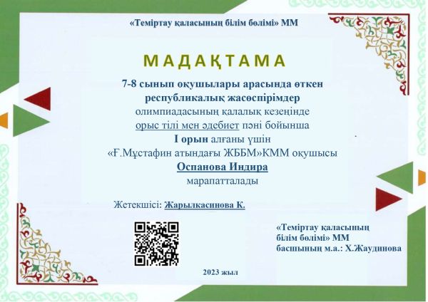 2.Оспанова Индира 8 - сынып оқушысы,орыс тілі -1 орын, пән мұғалімі Жарылкасинова К.