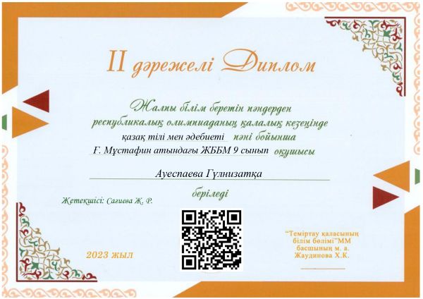 4. Ауеспаева Гүлзинат 9 сынып оқушысы - 2 орын қазақ тілі мен әдебиеті пәні бойынша - жетекшісі Сагиева Жадыра Рымбековна