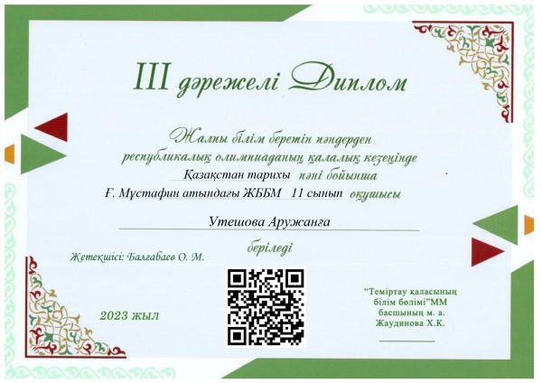 3. Утешова Аружан Муратовна  11 «А»  сынып оқушысы – 3 орын  – Қазақстан тарихы  пәні бойынша – жетекшісі – Балгабаев Ойрат Муратович
