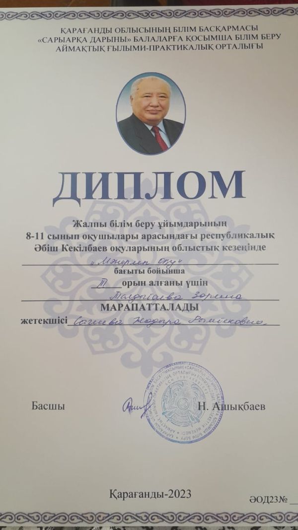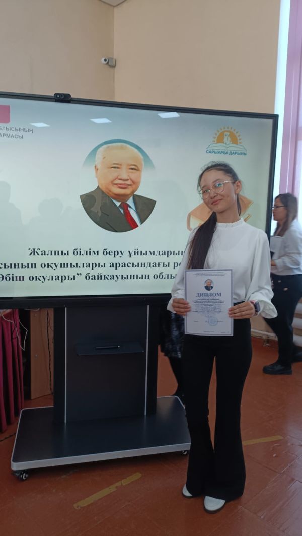 2023 жылы 24 наурыз күні 8-11 сынып оқушылары арасында республикалық Әбіш Кекілбаев оқуларының облыстық кезеңінде мектебіміздің 9 сынып оқушысы Талдыбаева Зарина 3 орын иеленді.Жетекшісі қазақ тілі мен әдебиет пәні мұғалімі Жадыра Рымбековна Сагиева. Оқушыларымыздың алар асулары көп болсын.Құттықтаймыз