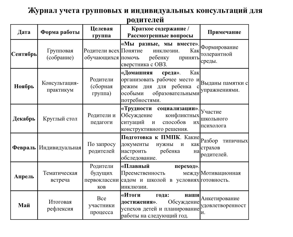 Февраль (Индивидуальные встречи): Проведен цикл бесед по подготовке к ПМПК. Родителям разъяснен правовой статус заключения и оказана психологическая поддержка в преодолении страхов перед комиссией.