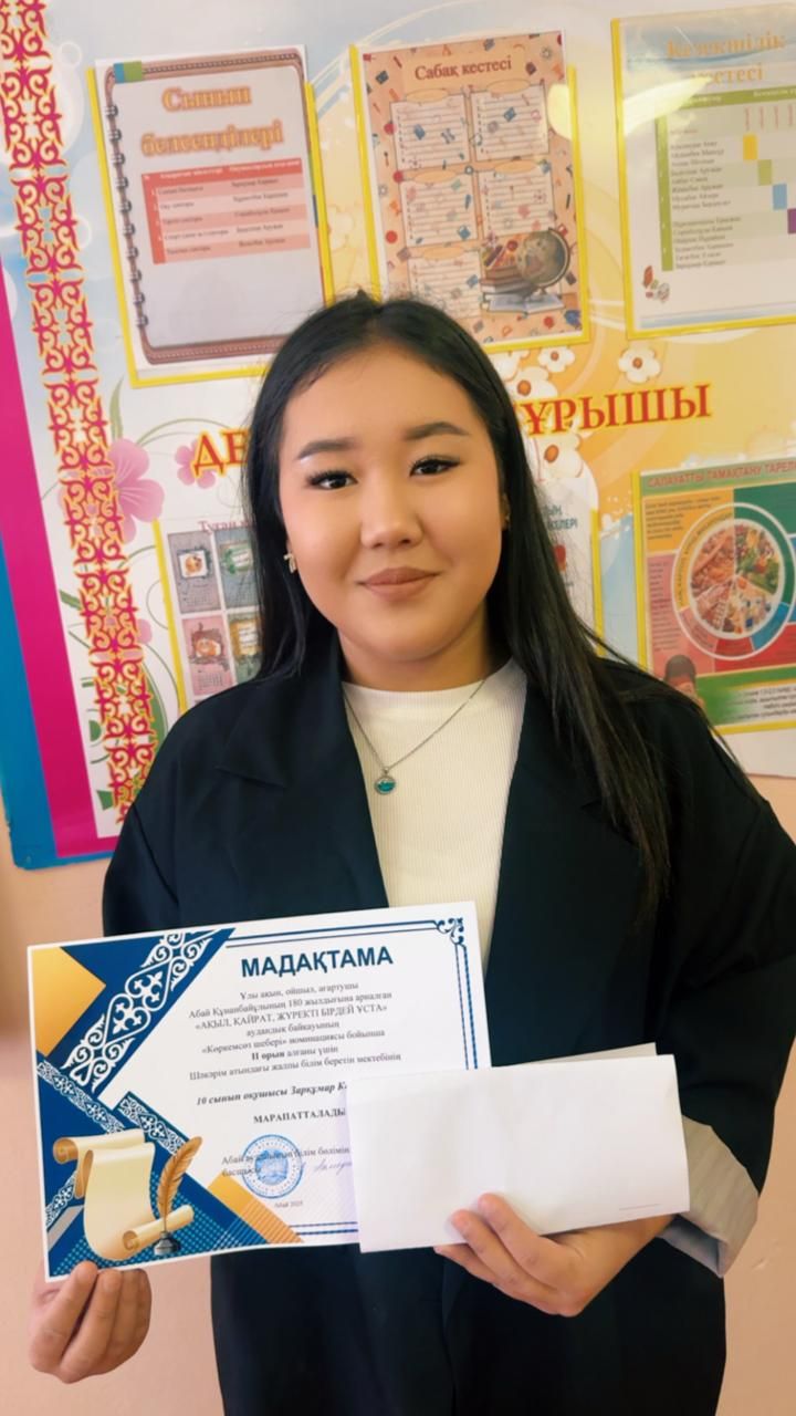 Абай Құнанбайұлының 180 жылдығына арналған “АҚЫЛ ,ҚАЙРАТ, ЖҮРЕКТІ БІРДЕЙ ҰСТА” аудандық байқауының “Көркемсөз шебері” номинациясы бойынша ll орынға ие болып мадақтама және ақшалай сыйақымен марапатталды.