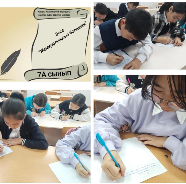 Сынып сағатында 7А сынып оқушылары сыбайлас жемқорлыққа қарсы мәдениетті қалыптастыру мақсатында "Жемқорлықсыз болашақ" тақырыптарына эссе жазды. Эссе жазу барысында оқушылар сыбайлас жемқорлыққа қарсы мәдениетті бойларына қалыптастыра отырып адалдық, әділдік, парасаттылық пен сенім сынды қасиеттерді бойларына сіңірту.