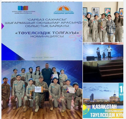2022 жылы 13-14 желтоқсан аралығында М.Жұмабаев атындағы ЖББ мектептің 7 сынып оқушылары Разақова Сания, Жансаева Аружан, Даптар Жансезім, Тасболатова Наргиза Смаилов Сабыржан, Сейтова Аяулым, Далелхан Батырхан, Ниязбек Марғұлан, Талғатұлы Әлібек, Нұрпейсов Төрехан, Шалдыбаев Ернұр "Жас Сарбаз" сыныптары арасында Қарағанды қаласының #2 оқушылар сарайында "Сарбаз сахнасы" облыстық әскери-патриоттық шығармашылық байқауына қатысып, "Тәуелсіздік толғауы" номинациясы бойынша I орынға ие болды. Сонымен қатар, "Жас Сарбаз" тобы ақшалай сертификатпен марапатталды. "Жас сарбаз" сыныбы оқушыларын дайындаған жетекшілері Усабаева Бөпежан Нұрланқызы мен Болатханов Ерлан Болатханұлына алғыс айтамыз. Шәкірттеріңіз биіктерден көріне берсін! Құттықтаймыз!