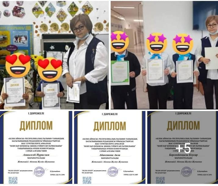 17—28 қараша аралығында "Білім айнасы" республикалық ғылыми —танымдық басылымының редакциясы ұйымдастырған жас суретшілерге арналған "Бояулар құпиясы: менің сүйікті мультфильмім" тақырыбында өткен конкурсына мектебіміздің оқушылары қатысып, жүлделі орын алып, дипломмен марапатталды. Аманжолова Ақпейіл —1орын;
