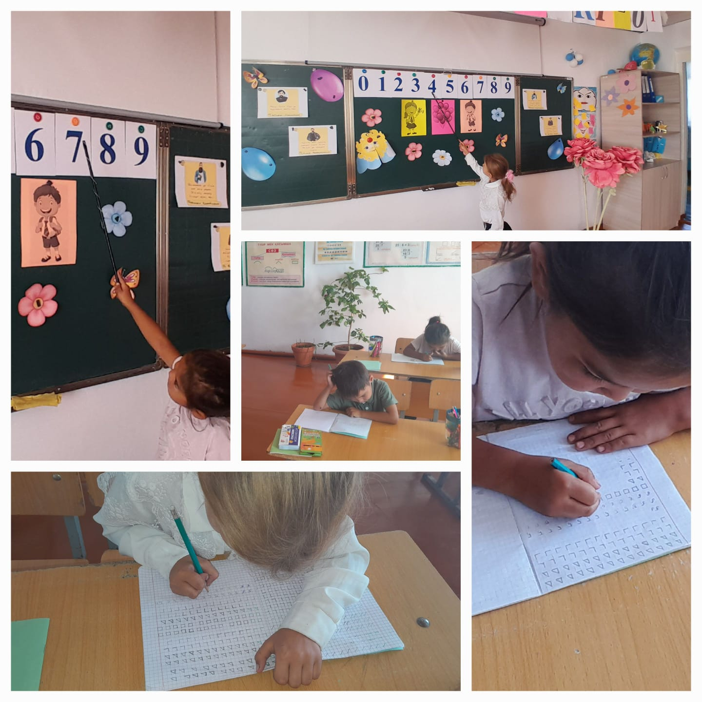 Балақай мектебінің жұмыстары жалғасын табуда. Дауысты дыбыстарды қайталап,кеңістік штрихтарын жазып,5-6 сандар элементтерімен танысты.