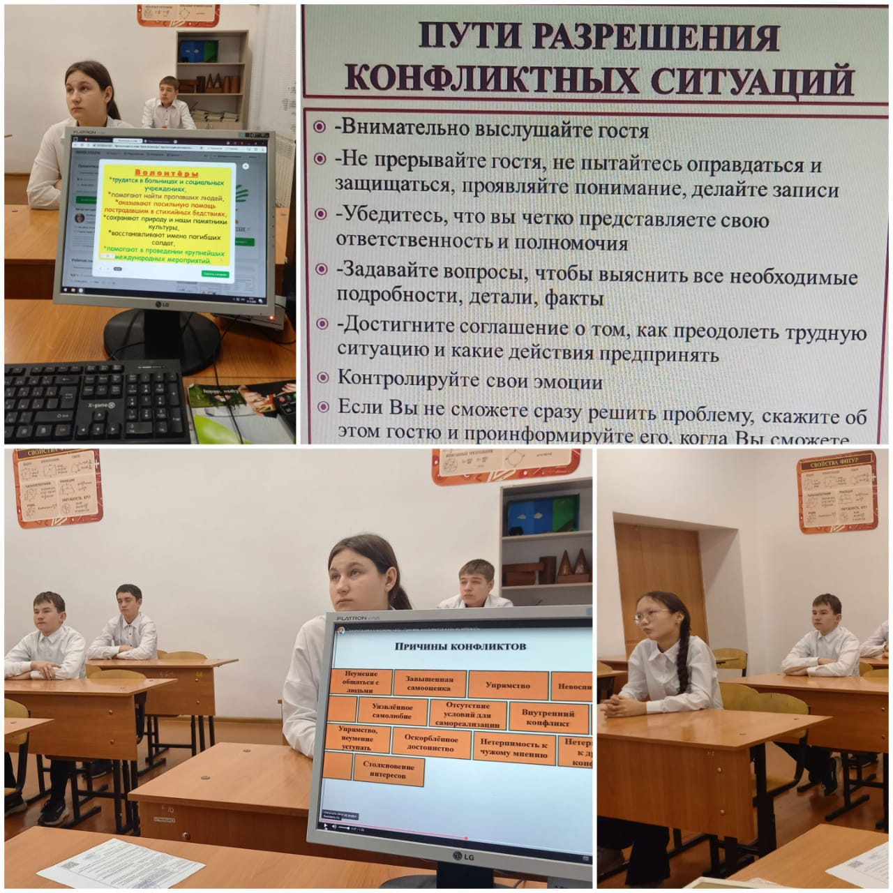 01.12.2025 года в ОШ имени  К.Мынбаева в "9Б " классе, классный руководитель Есенова Г.К, провела на классном часу урок безопасности на тему:" Пути решения конфликтной ситуации и как разрешить конфликт?.Как управлять уровнем агрессии". Цель: развить у учащихся навыки разрешения конфликтов и эффективного общения для достижения мирных решений.Учащиеся прослушали мини- лекцию  о видах конфликта, просмотрели видеоролики, отвечали на вопросы  .Конфликт- ситуация , в котором каждая из сторон занимает позицию, несовместимую  и противоположную по отношению к интересам другой стороны.Выделяют пять способов регулирования конфликтов: соревнования (конкуренция), приспособление, компромисс, избегание, сотрудничество.