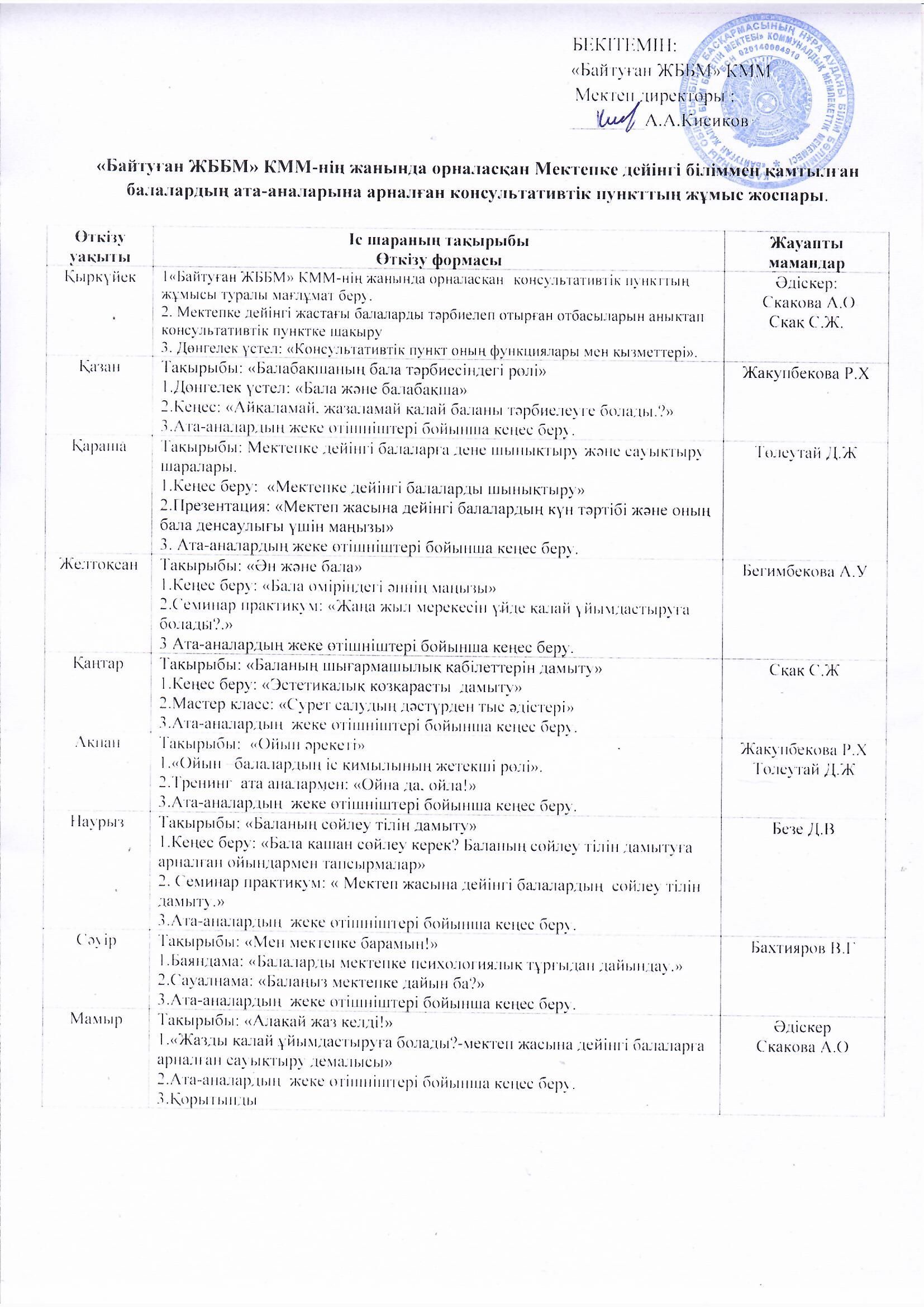 аға тәрбиеші, педагог-психолог, музыка жетекшісі, қазақ тілі мұғалімі