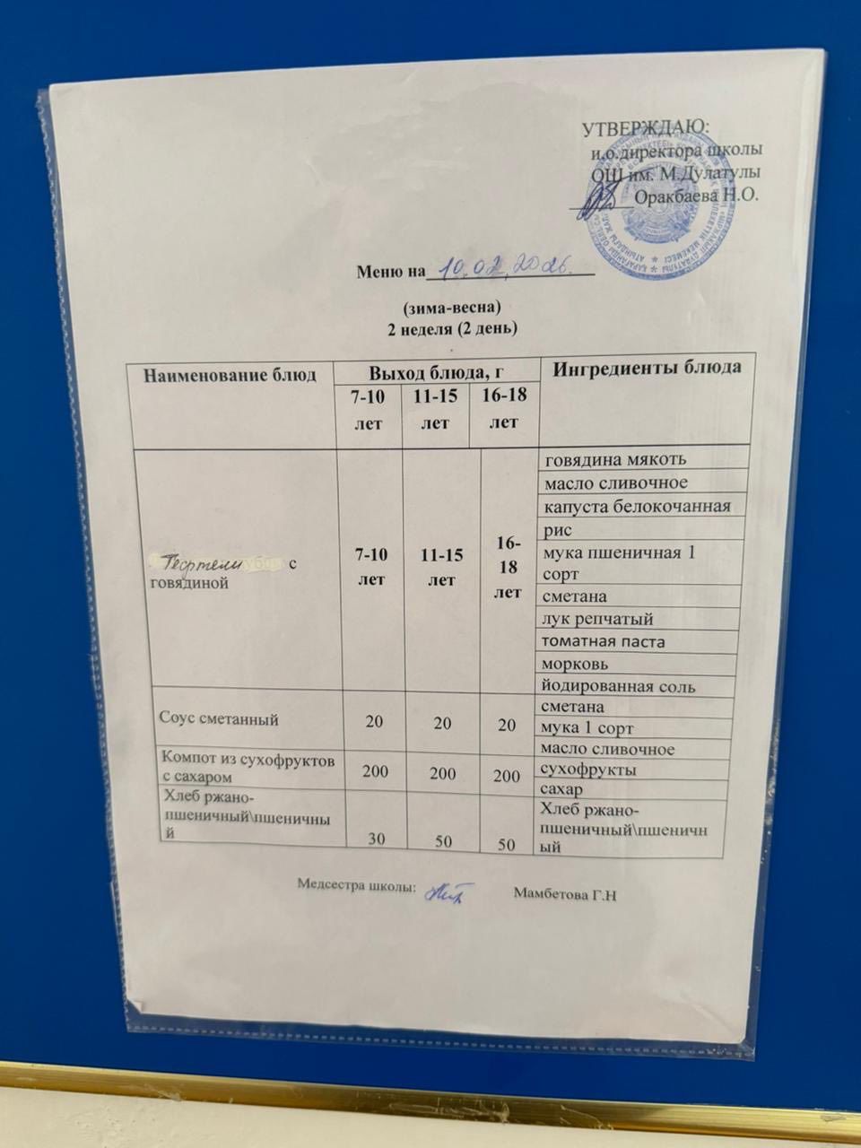 Мектеп оқушыларының тамақтануы туралы ақпарат. 2026 жылдың 10 ақпан күні мектеп оқушыларына арналған күнделікті тамақтану рационы төмендегідей ұйымдастырылды.