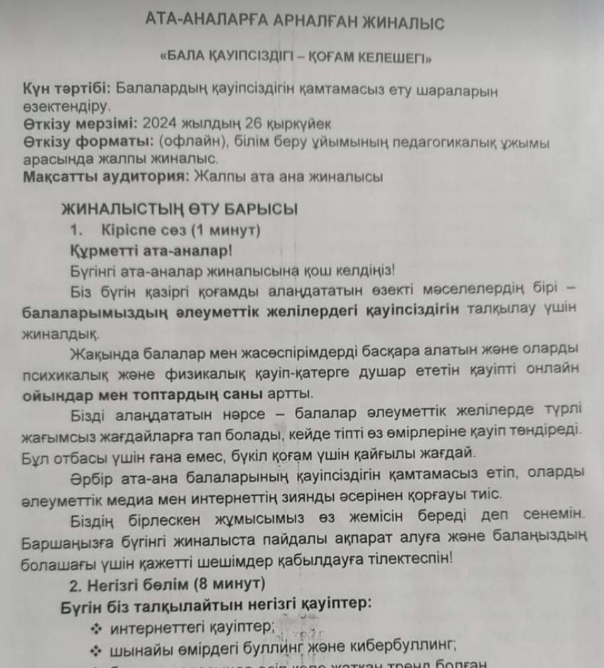 26 .09.2024 күні  жалпы ата-ана жиналысы өтті. Күн тәртібінде - балалардың қауіпсіздігін қамтамасыз ету шараларын өзектендіру.