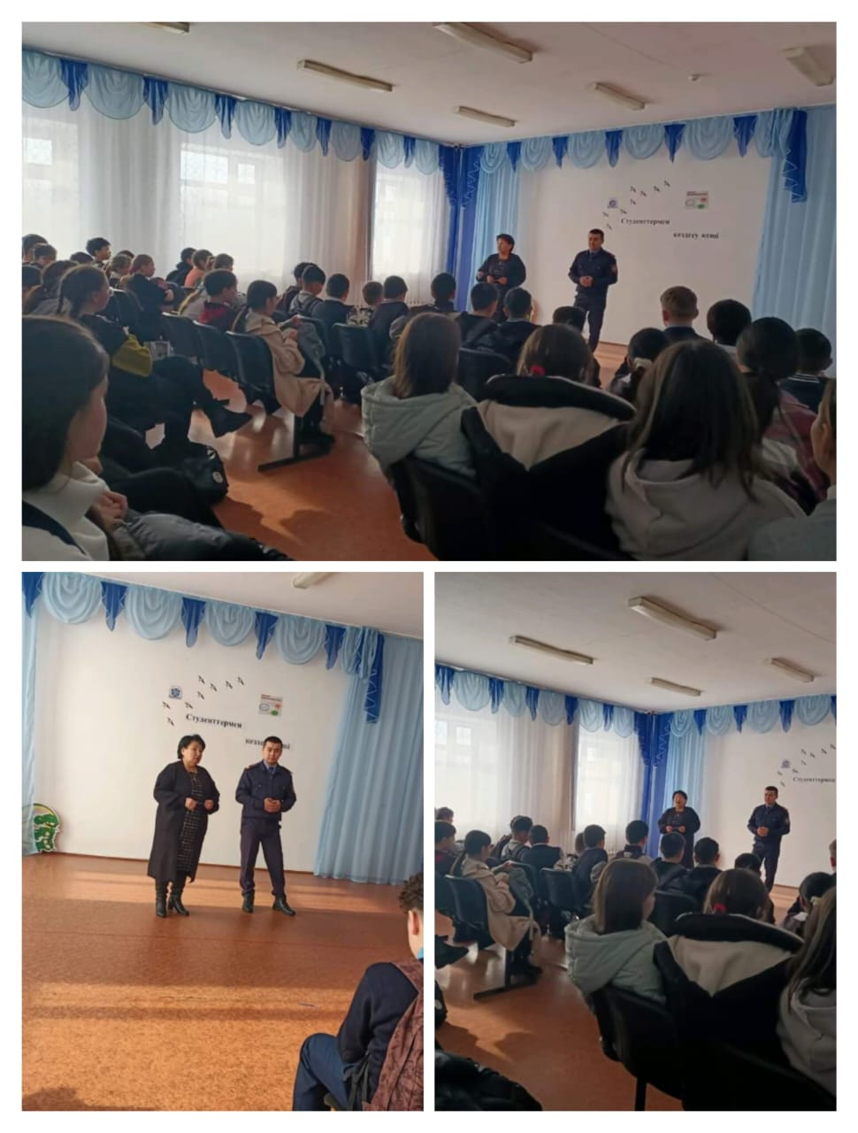 Мектебімізде Нұра ауданының прокурорының тапсырмасы бойынша кәмелетке толмағандар ісі жөніндегі инспекторы полиция лейтенанты Романкулов Р.Б. кәмелетке толмағандар арасындағы құқық бұзушылықтың, зорлық -зомбылықтың, қорлаудың, қудалаудың, балалар ортасында мектептегі атыстардың алдын-алу туралы түсінік қалыптастыру мақсатында 5-10 сынып оқушылары арасында "Әкімшілік құқық бұзушылық", "Қылмыстық құқық бұзушылық" ,"Бұзақылық" , "Жыныстық қол сұғылмаушылық" тақырыптарында дәріс оқыды.
