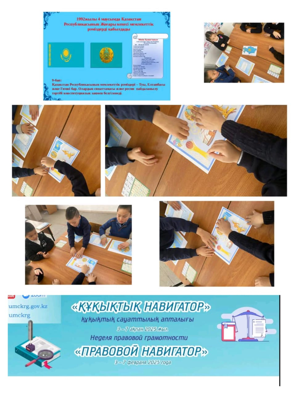 Құқықтық навигатор" құқықтық сауаттылық апталығы аясында бастауыш сынып оқушыларымен "Қазақстан Республикасының Мемлекеттік рәміздері" тақырыпта сынып сағаты өтті.