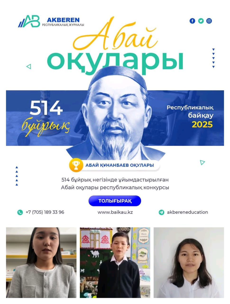Абай Құнанбайұлының 180 жылдығына орай "Ақберен" шығармашылық-танымдық журналының ұйымдастыруымен республикалық "Абай" оқулары байқауына мектебіміздің оқушылары қатысып, жүлделі орындарға ие болды.