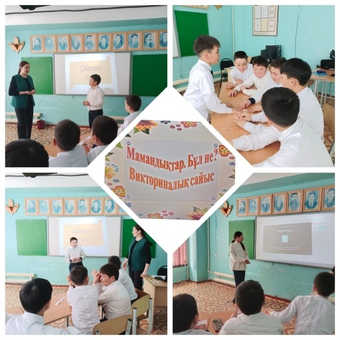Кәсіби бағдар беру жұмыс жоспары бойынша, "Еңбегі адал -жас өрен" жобасы аясында 7 "Б" сынып оқушыларымен "Мамандық.Бұл не?" интеллектуалды ойыны өтті. Мақсаты: оқушыларға мамандық туралы мағлұмат беру, қазіргі заман талабына сай мамандықтарын кеңінен таныстыру.