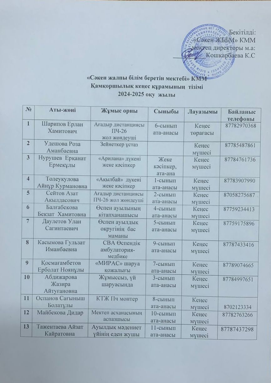 Қазақстан Республикасы  Білім және ғылым министрінің 2017 жылғы 27 шілдедегі  355 бұйрығымен бекітілген "Білім беру ұйымдарында қамқоршылық кеңестің жұмысын ұйымдастыру және оны сайлау тәртібінің үлгілік қағида" негізінде  "Сәкен ЖББМ" КММ мектепке қолдау көрсету мақсатында қамқоршылық кеңесі төмендегідей құрамда бекітілді.