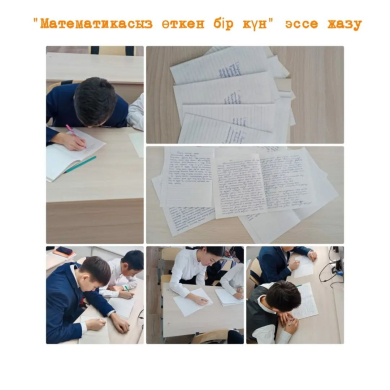"Математика айналамызда" математикалық сауаттылық апталық аясындағы іс-шара жоспарына сәйкес 8—сынып оқушылары "Математикасыз өткен бір күн" тақырыбын кеңінен ашып эссе жазды.