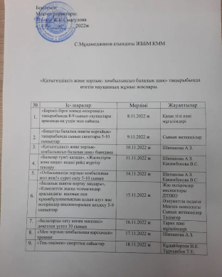 С.Мұқамеджанов атындағы ЖББМ "Қатыгездіксіз және зорлық-зомбылықсыз балалық шақ " тақырыбында өтетін іс-шара жоспары.