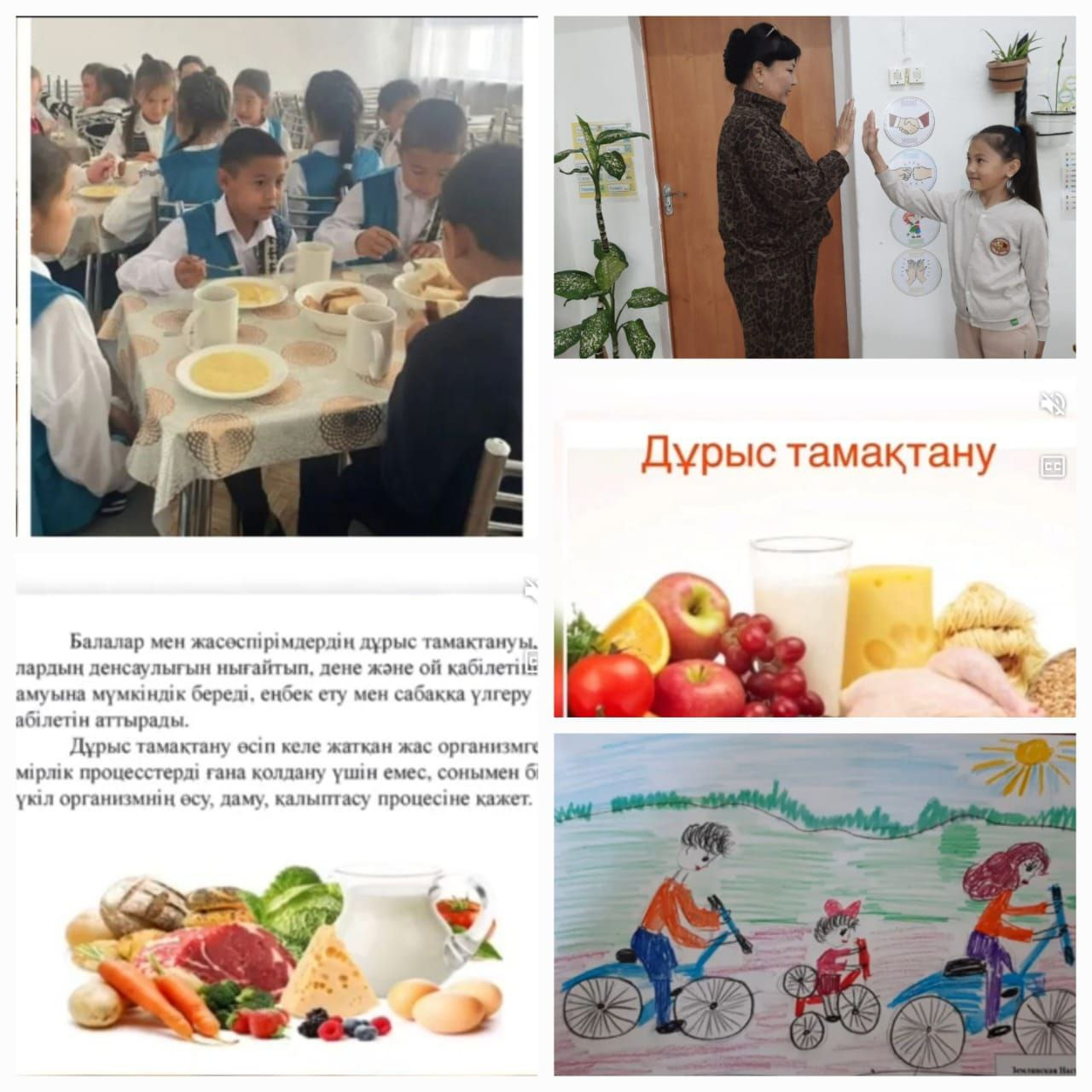 Бугин 12.09. 4 казак сыныбында "Дұрыс тамақтану денсаулық кепілі" атты сынып сағаты өтті . Сынып сағаты барысында балалар денсаулыққа пайдалы тағамдар туралы айтып, ойларымен бөлісті. Сынып жетекшісі: Жаманбаева А.Ж