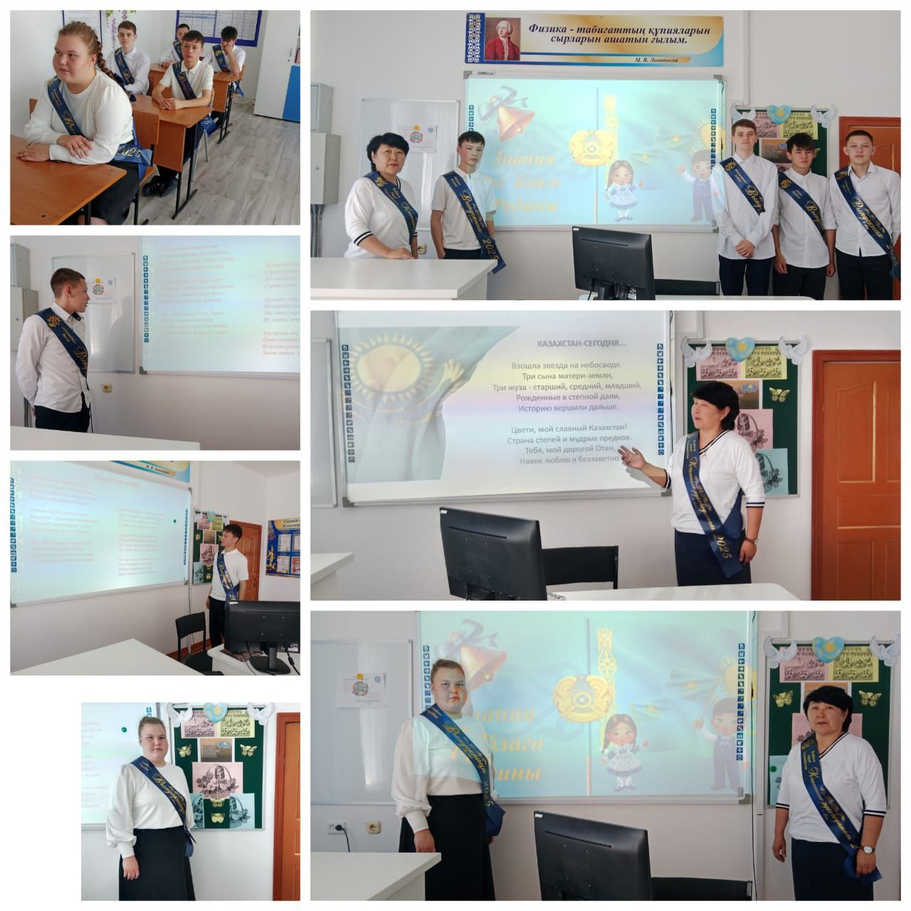 Қалиева Айгүл Нұрмақовна 9 орыс сыныбында "Білімім- Отаныма " атты сынып сағатын өткізді.Сынып сағатында оқушыларға еліміздің болашағы жарқын болуы үшін, өсіп келе жатқан жас ұрпақ білімді,тәртіпті,тәрбиелі болуы керек екендігі түсіндірілді. Оқушылардың оқу жылындағы жасаған жетістіктерін талдап,жазғы демалыста жақсы демалып келіп,келесі оқу жылында көптеген жетістікке қол жеткіземіз деген шешімдеміз