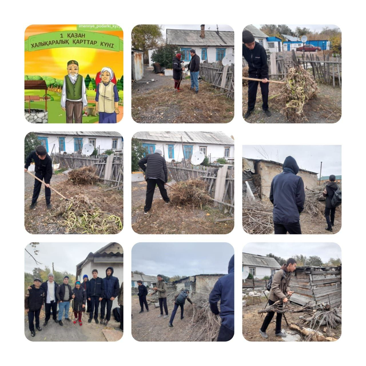 30.09 күні қарттар күніне орай "Қамқор" жобасы бойынша волонтерлік жұмысының негізгі бағыты, көмек көрсету мақсатында, мектебіміздің оқушылары Сидорович Раиса әженің үйіне барып, кірпіштерді тасып, есік алдындағы бақшадан қалған шөптерді сыртқа шығарып берді. Есіктің алдында үйілген ағаштарды керек орнына тасып берді.