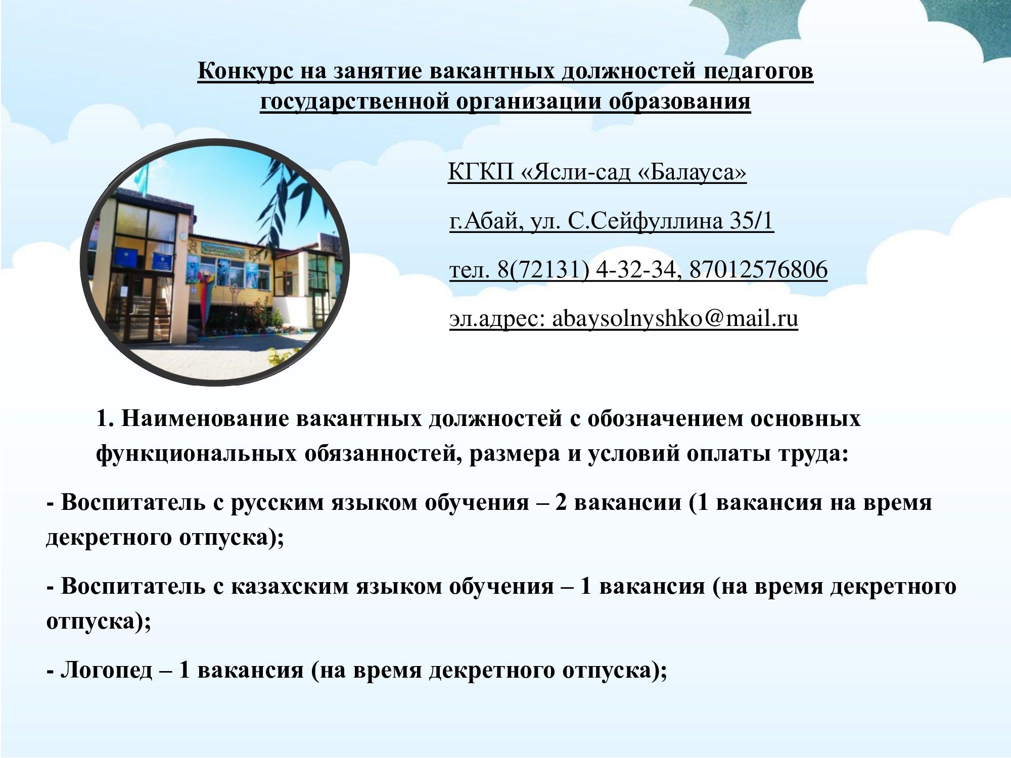 Конкурс на занятие вакантных должностей педагогов государственной организации образования: - Воспитатель с русским языком обучения – 2 вакансии (1 вакансия на время декретного отпуска);