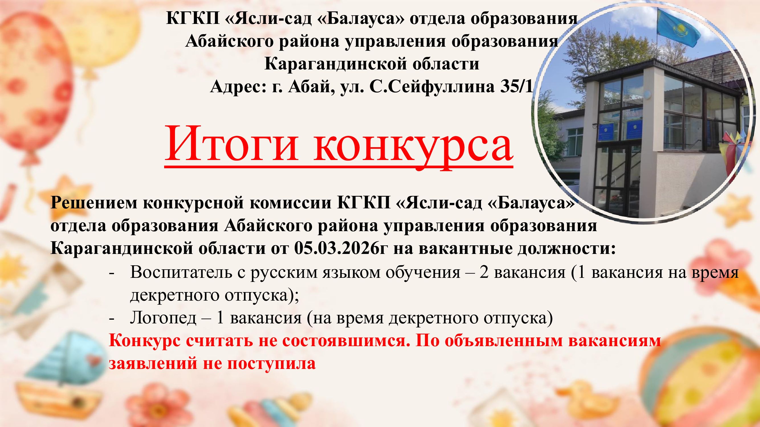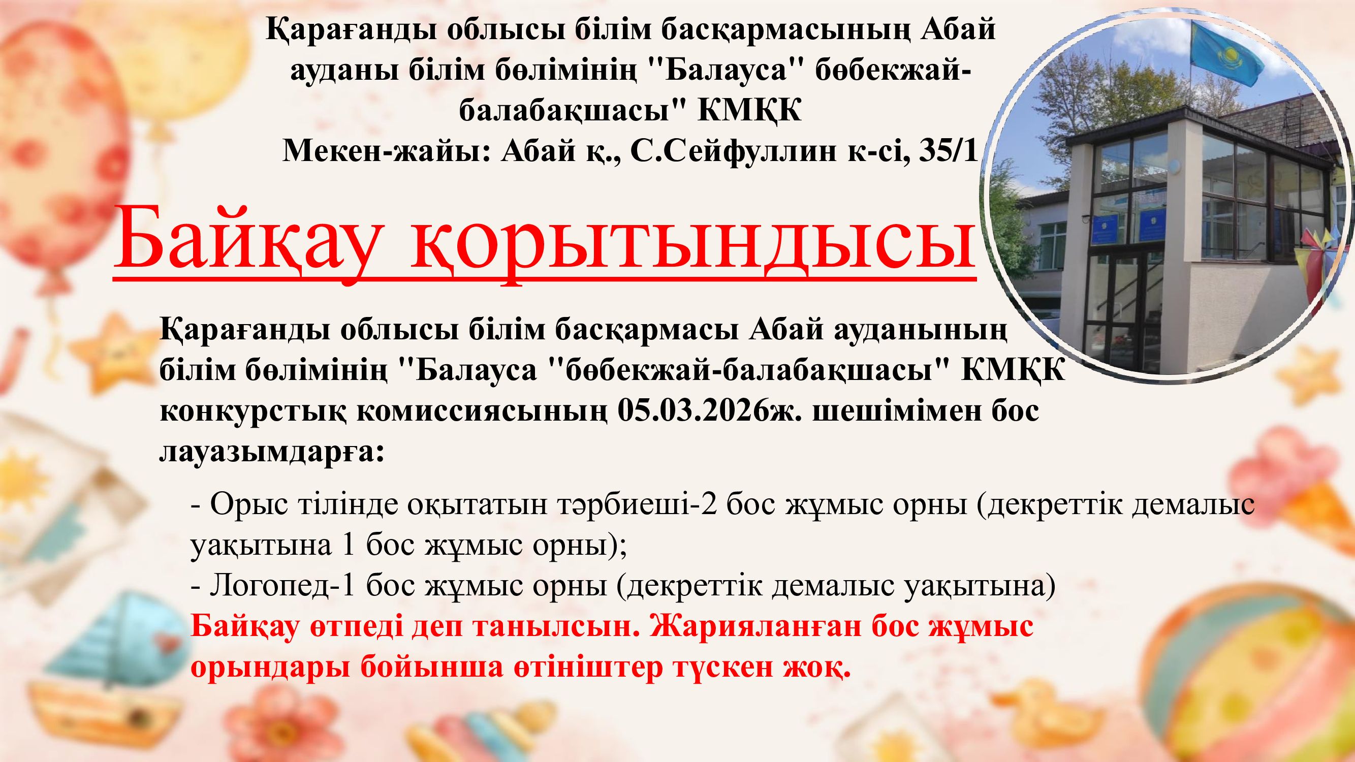 Қарағанды облысы білім басқармасының Абай ауданы білім бөлімінің «Балауса» бөбекжай-балабақшасы» коммуналдық мемлекеттік қазыналық кәсіпорыны