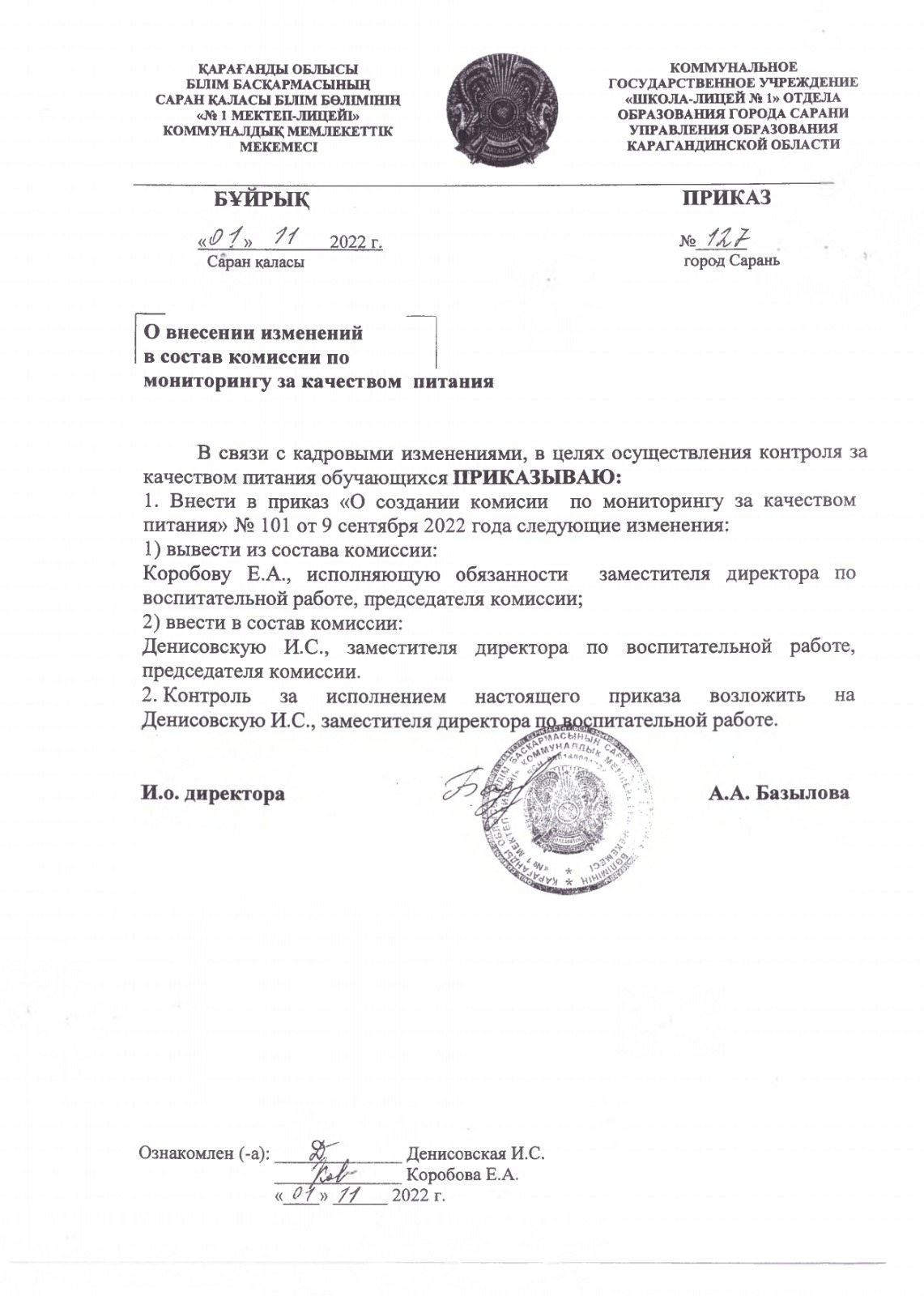 О внесении изменений в состав комиссии по мониторингу за качеством питания№127 от 01.11.2022 г. |
