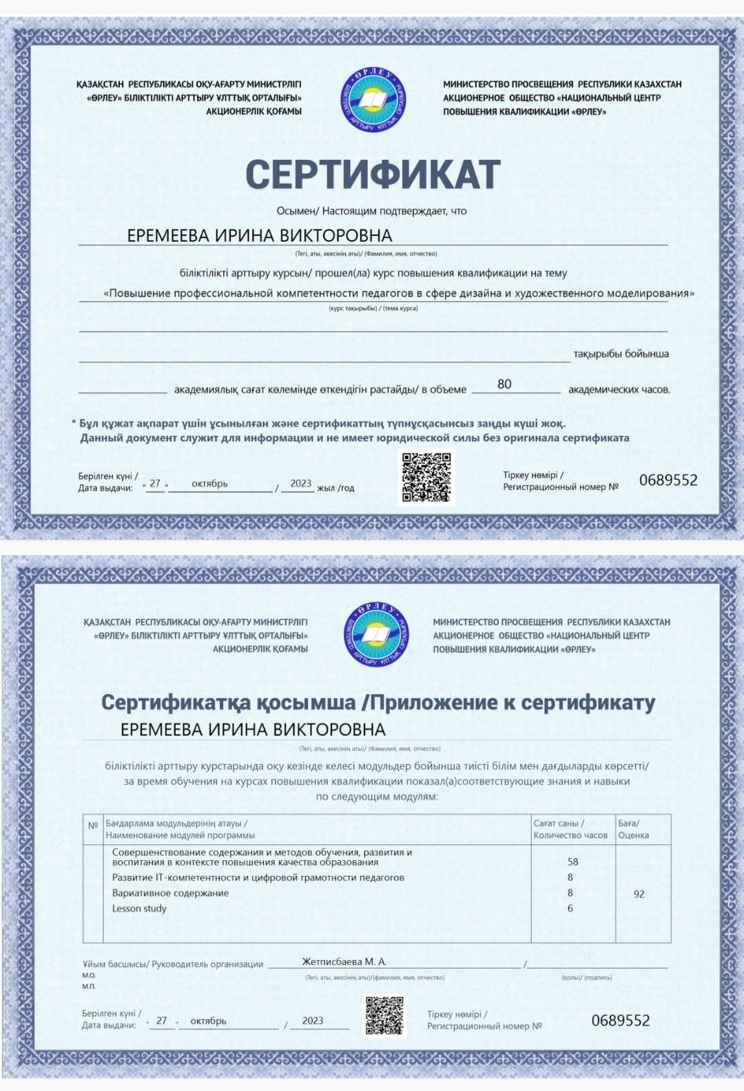 Еремеева Ирина Викторовнанациональный центр повышения квалификации "Өрлеу", "Развитие профессиональной компетентности педагогов в сфере дизайна и художественного моделирования" 16.10.2023-27.10.2023 |