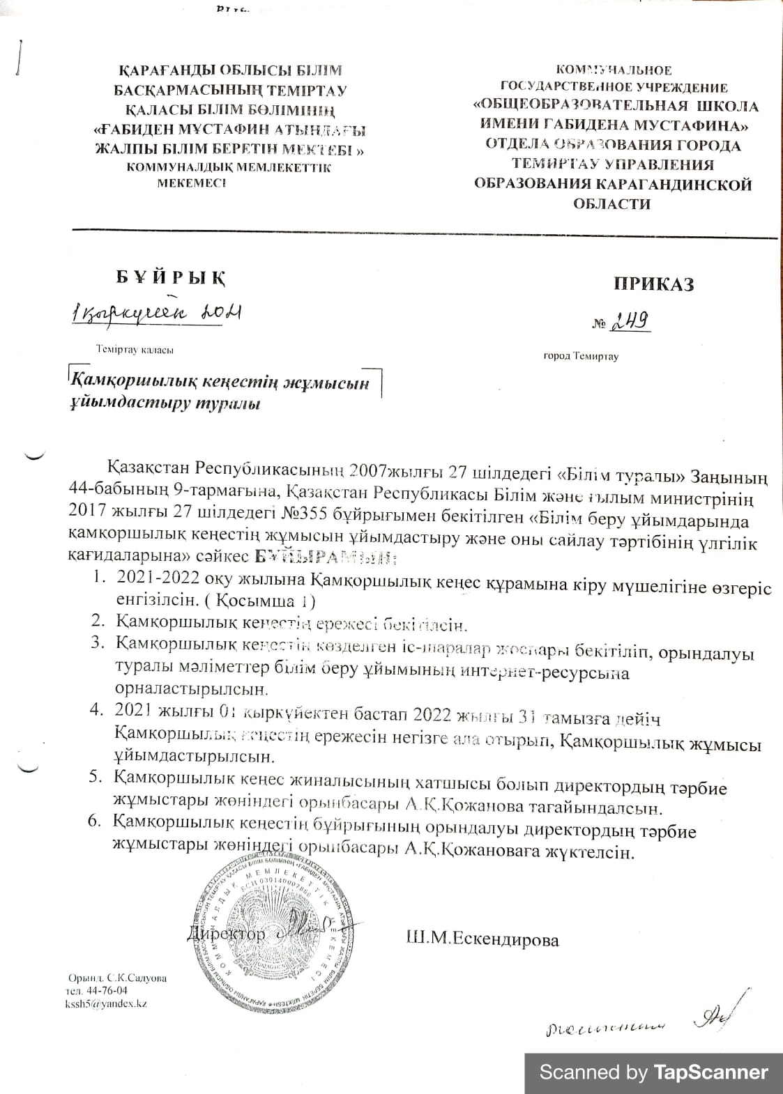 Қамқоршылық кеңесҚарағанды облысы білім басқармасының Теміртау қаласы білім бөлімінің "Ғабиден Мұстафин атындағы жалпы білім беретін мектебі" коммуналдық мемлекеттік мекемесінің 2021-2022 оқу жылына арналған қамқоршылық кеңесінің тізімі. |