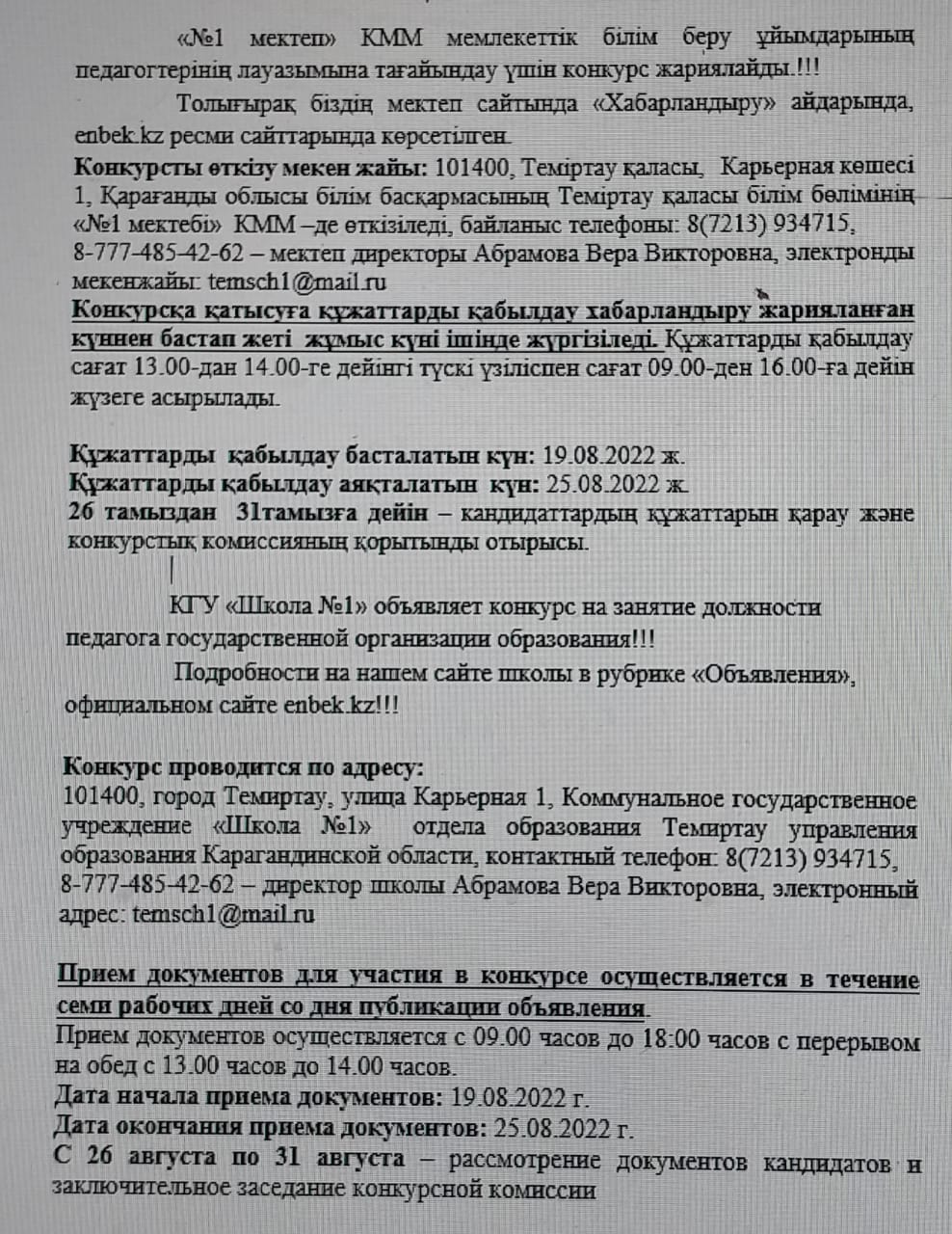 «№1 мектеп» КММ мемлекеттік білім беру ұйымдарының педагогтерінің лауазымына тағайындау үшін конкурс жариялайды.!!! Толығырақ біздің мектеп сайтында «Хабарландыру» айдарында, enbek.kz ресми сайттарында көрсетілген. Конкурсты өткізу мекен жайы: 101400, Теміртау қаласы, Карьерная көшесі 1, Қарағанды облысы білім басқармасының Теміртау қаласы білім бөлімінің «№1 мектебі» КММ –де өткізіледі, байланыс телефоны: 8(7213) 934715, 8-777-485-42-62 – мектеп директоры Абрамова Вера Викторовна, электронды мекенжайы: temsch1@mail.ru Конкурсқа қатысуға құжаттарды қабылдау хабарландыру жарияланған күннен бастап жеті жұмыс күні ішінде жүргізіледі. Құжаттарды қабылдау сағат 13.00-дан 14.00-ге дейінгі түскі үзіліспен сағат 09.00-ден 16.00-ға дейін жүзеге асырылады. Құжаттарды қабылдау басталатын күн: 19.08.2022 ж. Құжаттарды қабылдау аяқталатын күн: 25.08.2022 ж. 26 тамыздан 31тамызға дейін – кандидаттардың құжаттарын қарау және конкурстық комиссияның қорытынды отырысы. КГУ «Школа №1» объявляет конкурс на занятие должности педагога государственной организации образования!!! Подробности на нашем сайте школы в рубрике «Объявления», официальном сайте enbek.kz!!! Конкурс проводится по адресу: 101400, город Темиртау, улица Карьерная 1, Коммунальное государственное учреждение «Школа №1» отдела образования Темиртау управления образования Карагандинской области, контактный телефон: 8(7213) 934715, 8-777-485-42-62 – директор школы Абрамова Вера Викторовна, электронный адрес: temsch1@mail.ru Прием документов для участия в конкурсе осуществляется в течение семи рабочих дней со дня публикации объявления. Прием документов осуществляется с 09.00 часов до 18:00 часов с перерывом на обед с 13.00 часов до 14.00 часов. Дата начала приема документов: 19.08.2022 г. Дата окончания приема документов: 25.08.2022 г. С 26 августа по 31 августа – рассмотрение документов кандидатов и заключительное заседание конкурсной комиссии