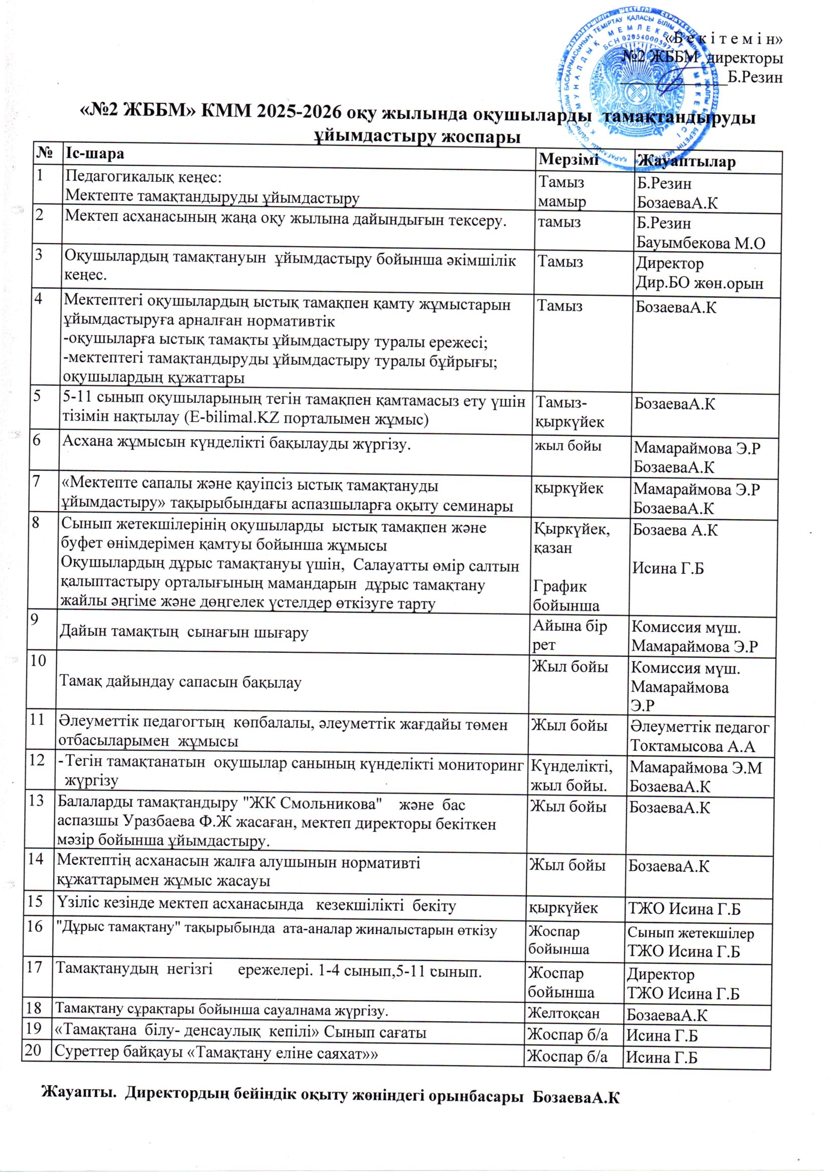 Тамақтану жоспары2025-2026 оқу жылында оқушыларды тамақтандыруды ұйымдастыру жоспары |