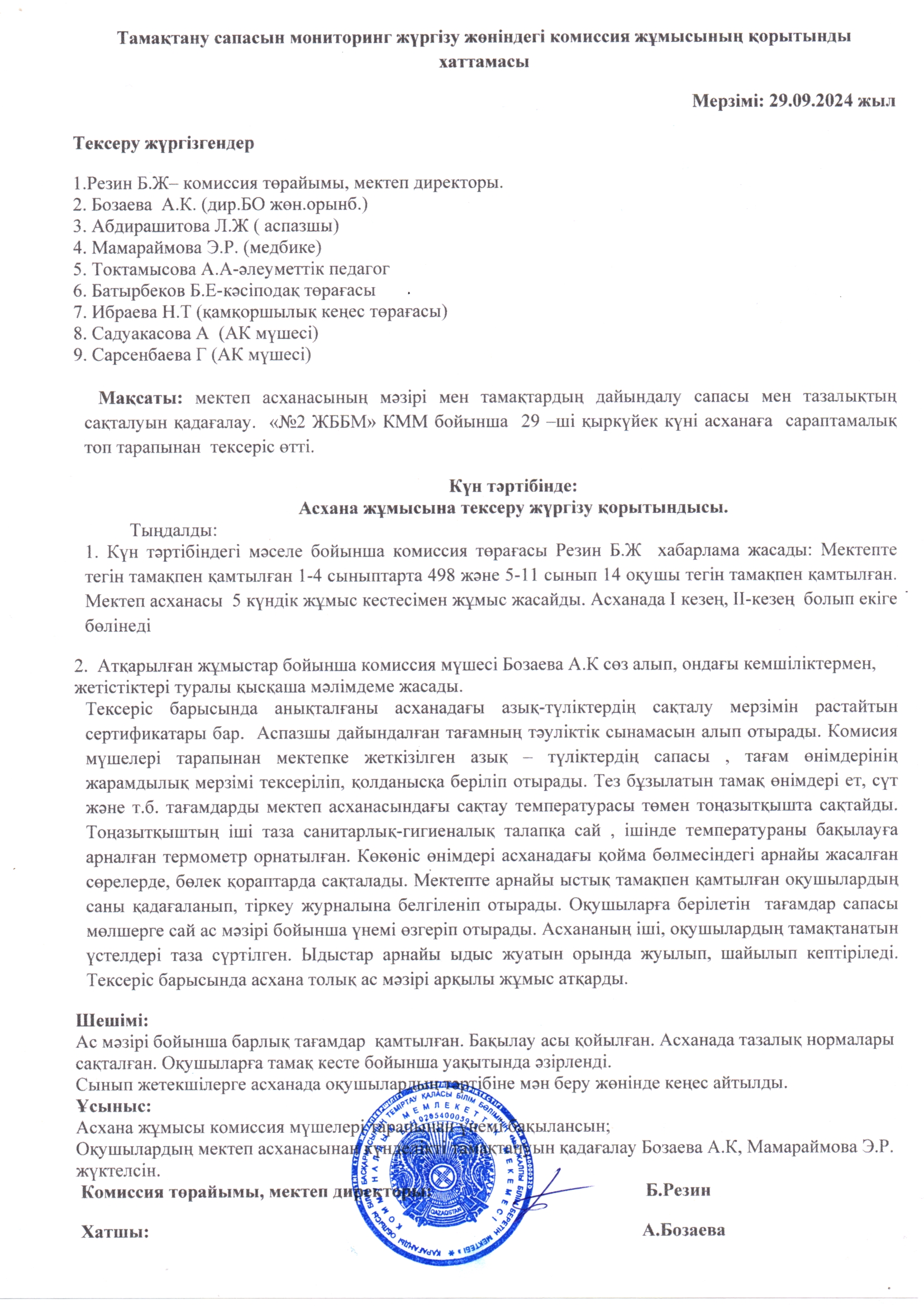 Хаттама қыркүйек айыТамақтану сапасын мониторинг жүргізу жөніндегі комиссия жұмысының қорытынды хаттамасы |