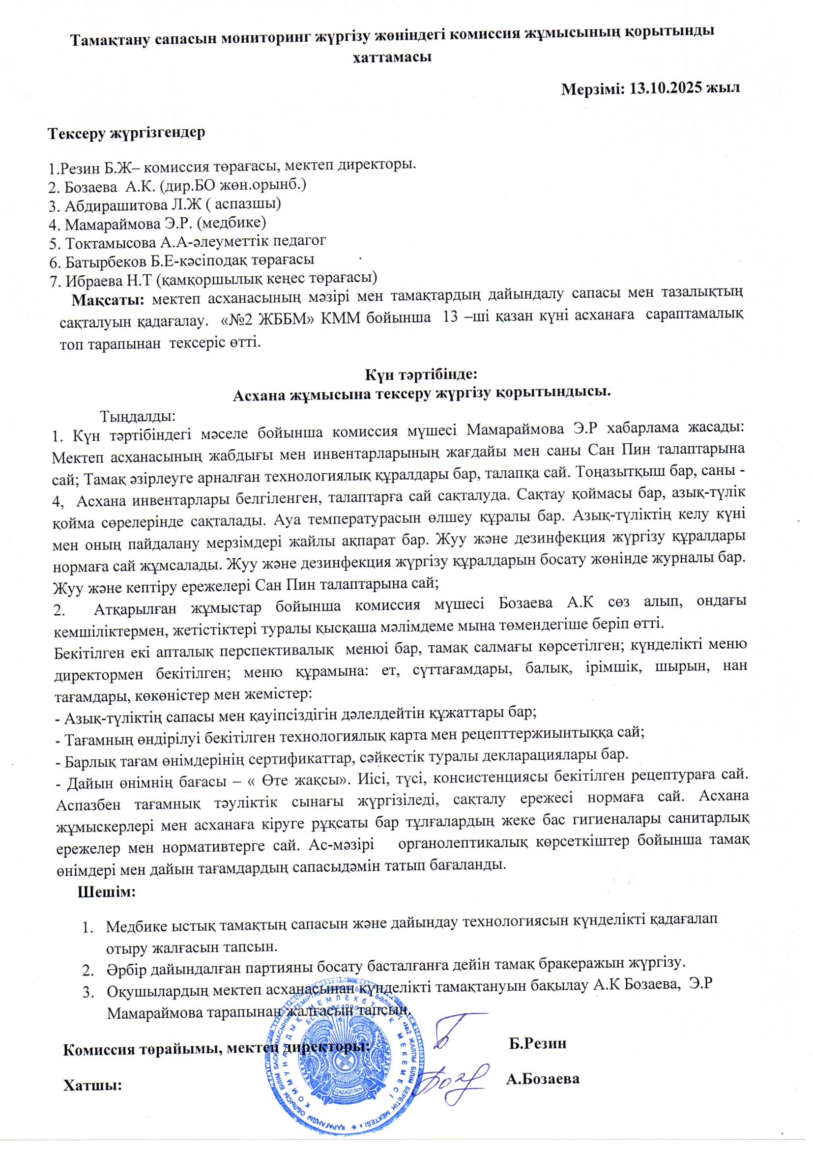 Хаттама қазан айыТамақтану сапасын мониторинг жүргізу жөніндегі комиссия жұмысының қорытынды хаттамасы |