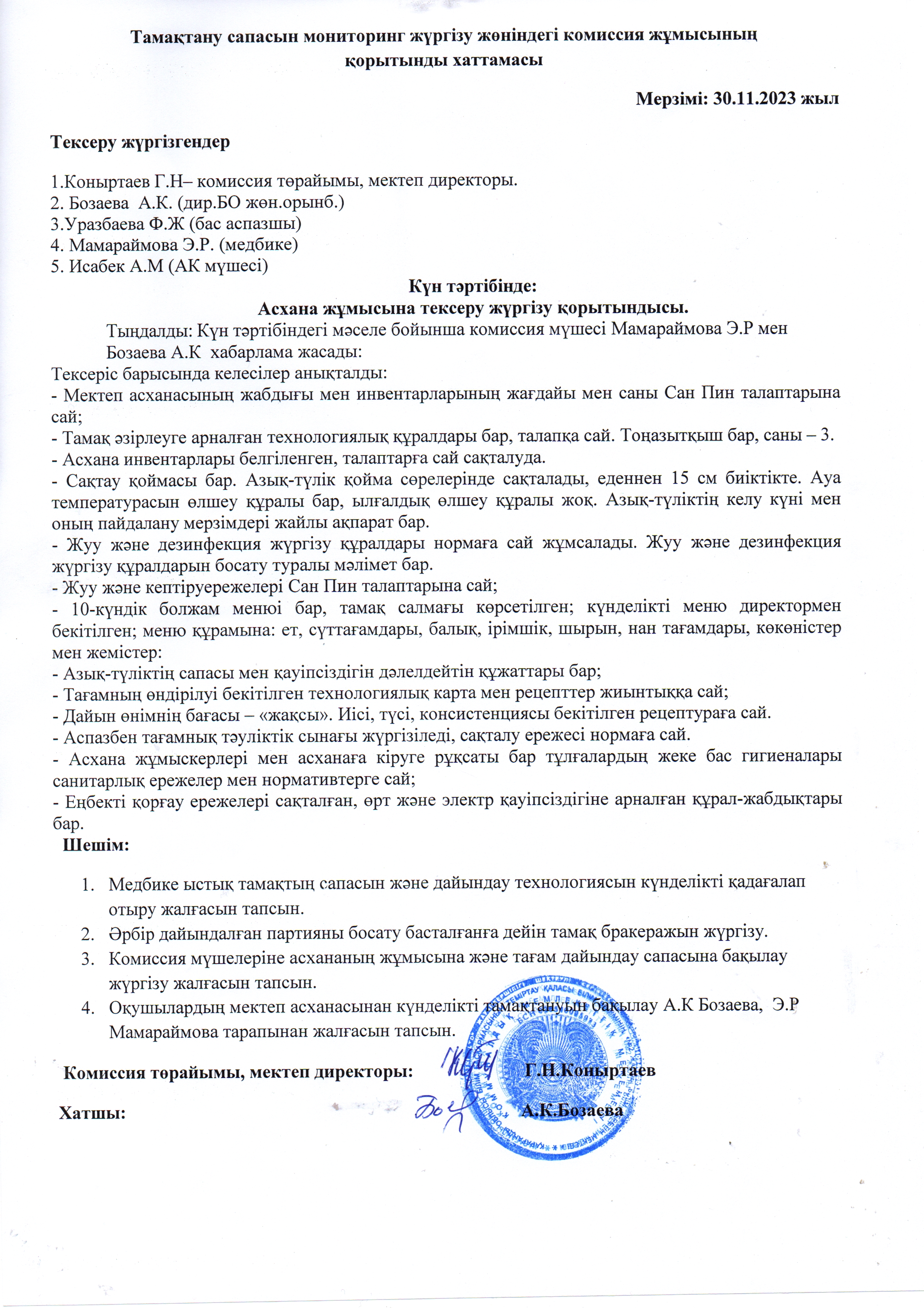 Тамақтану сапасын мониторинг жүргізу жөніндегі комиссия жұмысының қорытынды хаттамасы. Қараша айыТамақтану сапасын мониторинг жүргізу жөніндегі комиссия жұмысының қорытынды хаттамасы. Қараша айы |