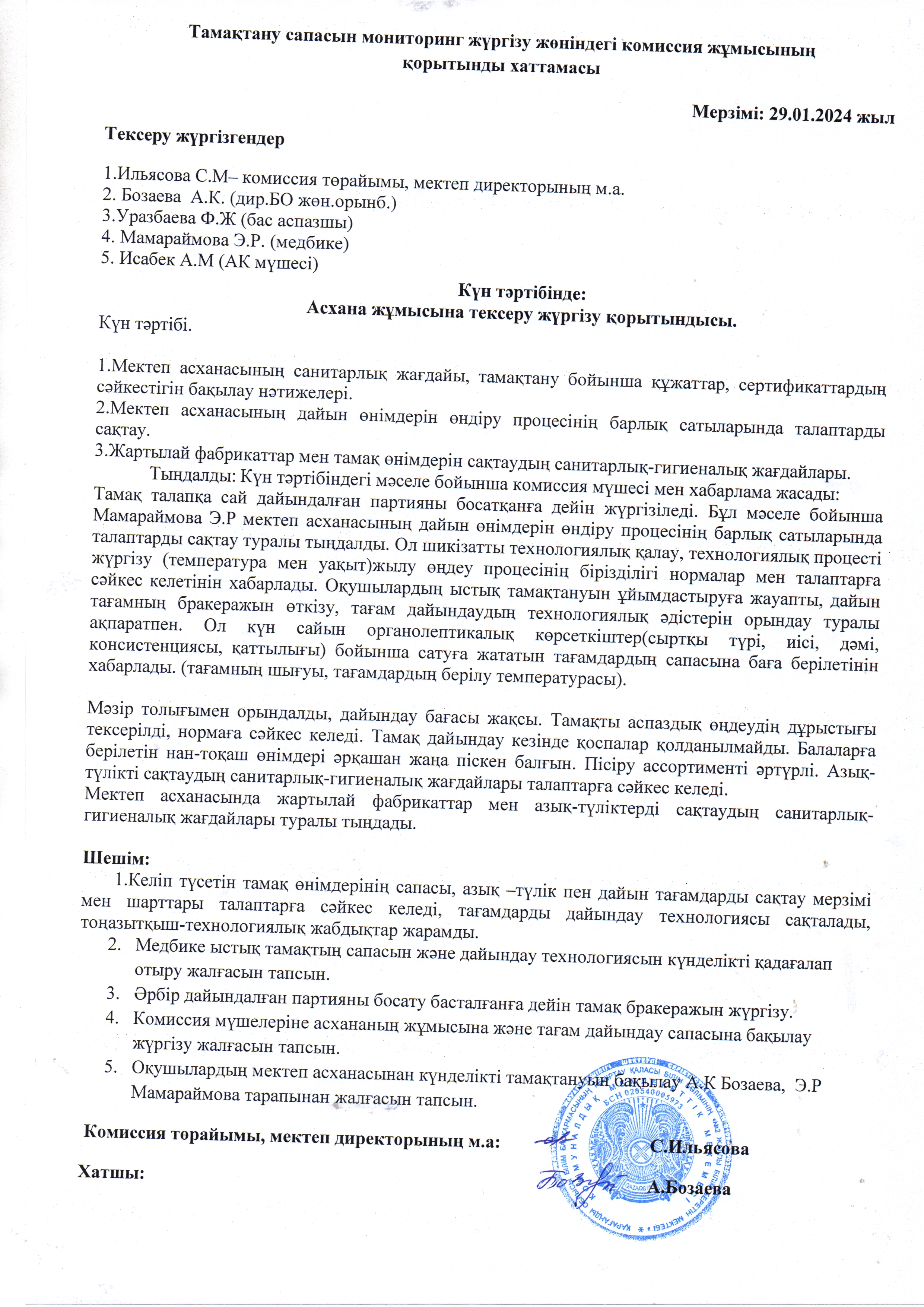 Тамақтану сапасын мониторинг жүргізу жөніндегі комиссия жұмысының қорытынды хаттамасы. Қантар айыТамақтану сапасын мониторинг жүргізу жөніндегі комиссия жұмысының қорытынды хаттамасы. Қантар айы |