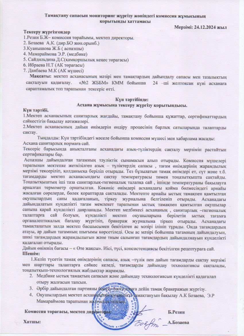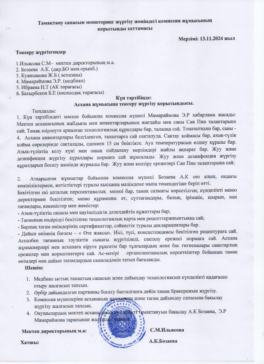 Тамақтану сапасын мониторинг жүргізу жөніндегі комиссия жұмысының қорытынды хаттамасы.