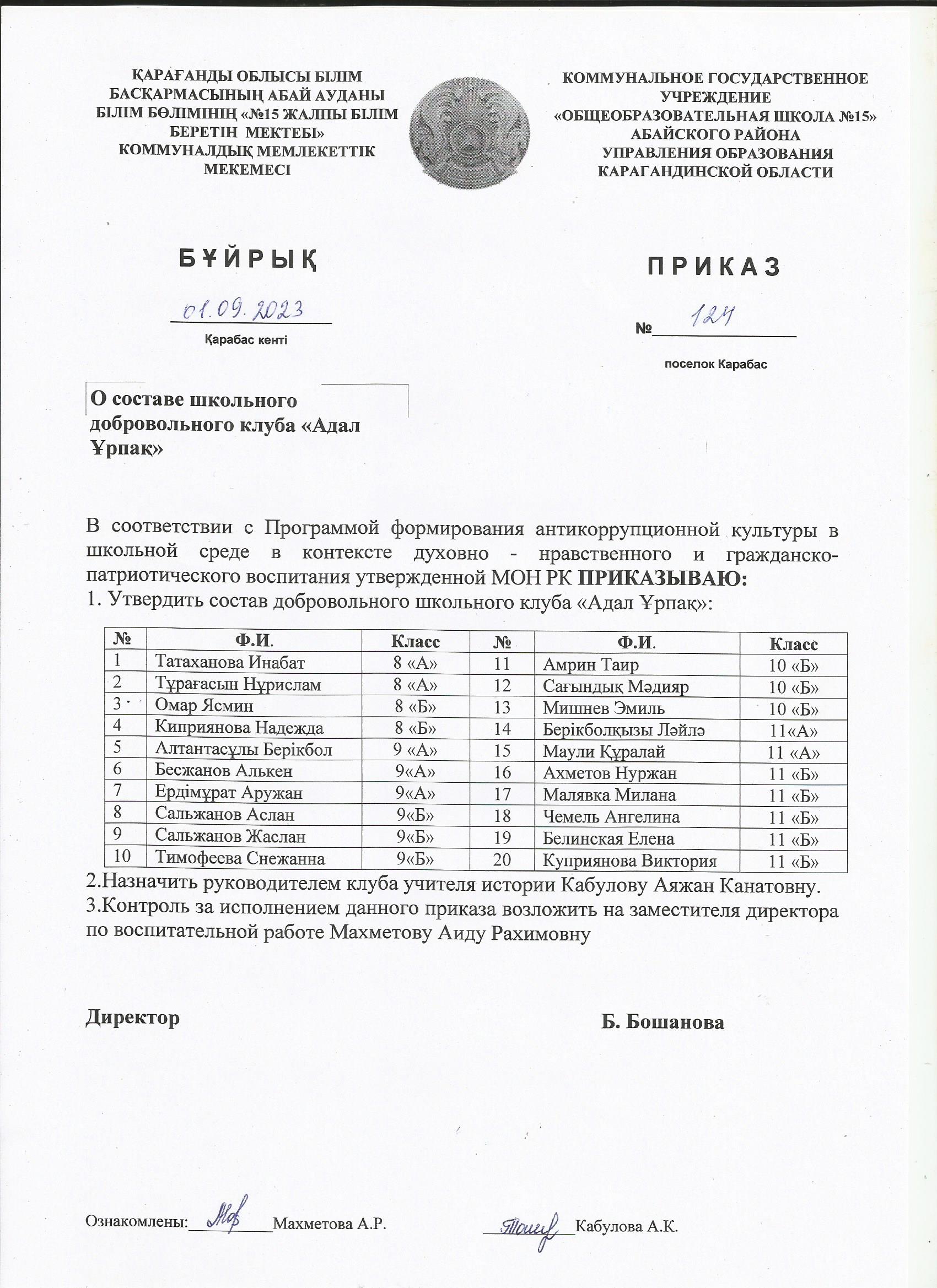 Бұйрық "ЖББМ №15" 01.09.2023 жыл"Адал Ұрпақ" ерікті мектеп клубының жұмысы туралы |