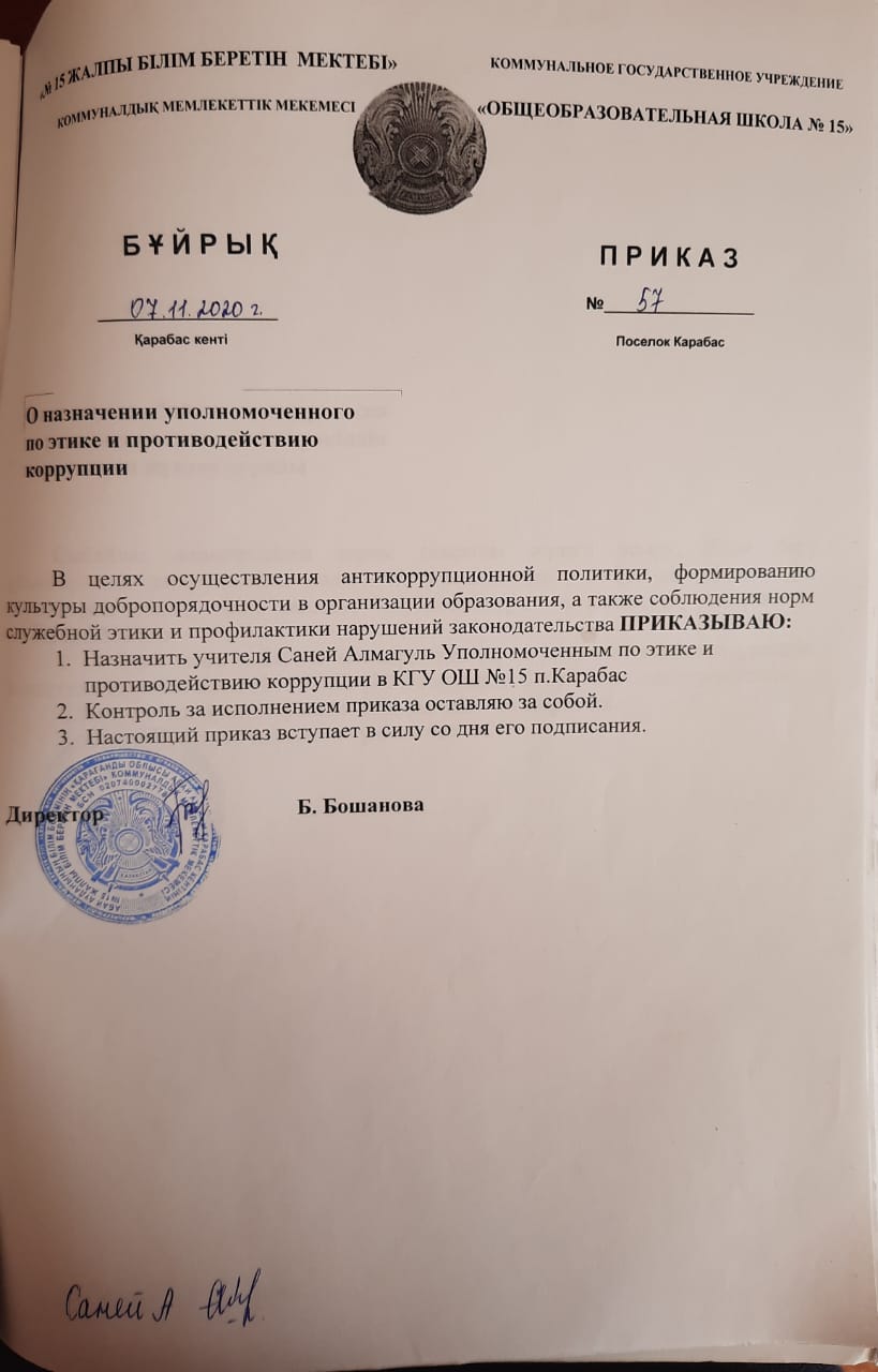 Приказ КГУ "Общеобразовательная школа № 15"О назначении уполномоченного по этике и противодействию коррупции |