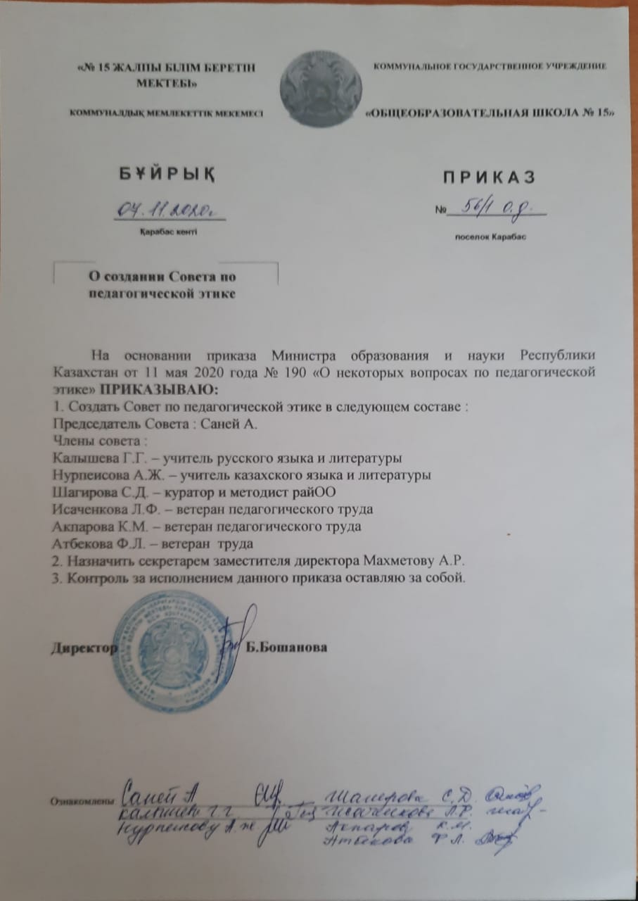 Приказ КГУ "Общеобразовательная школа № 15"О создании Совета по педагогической этике |