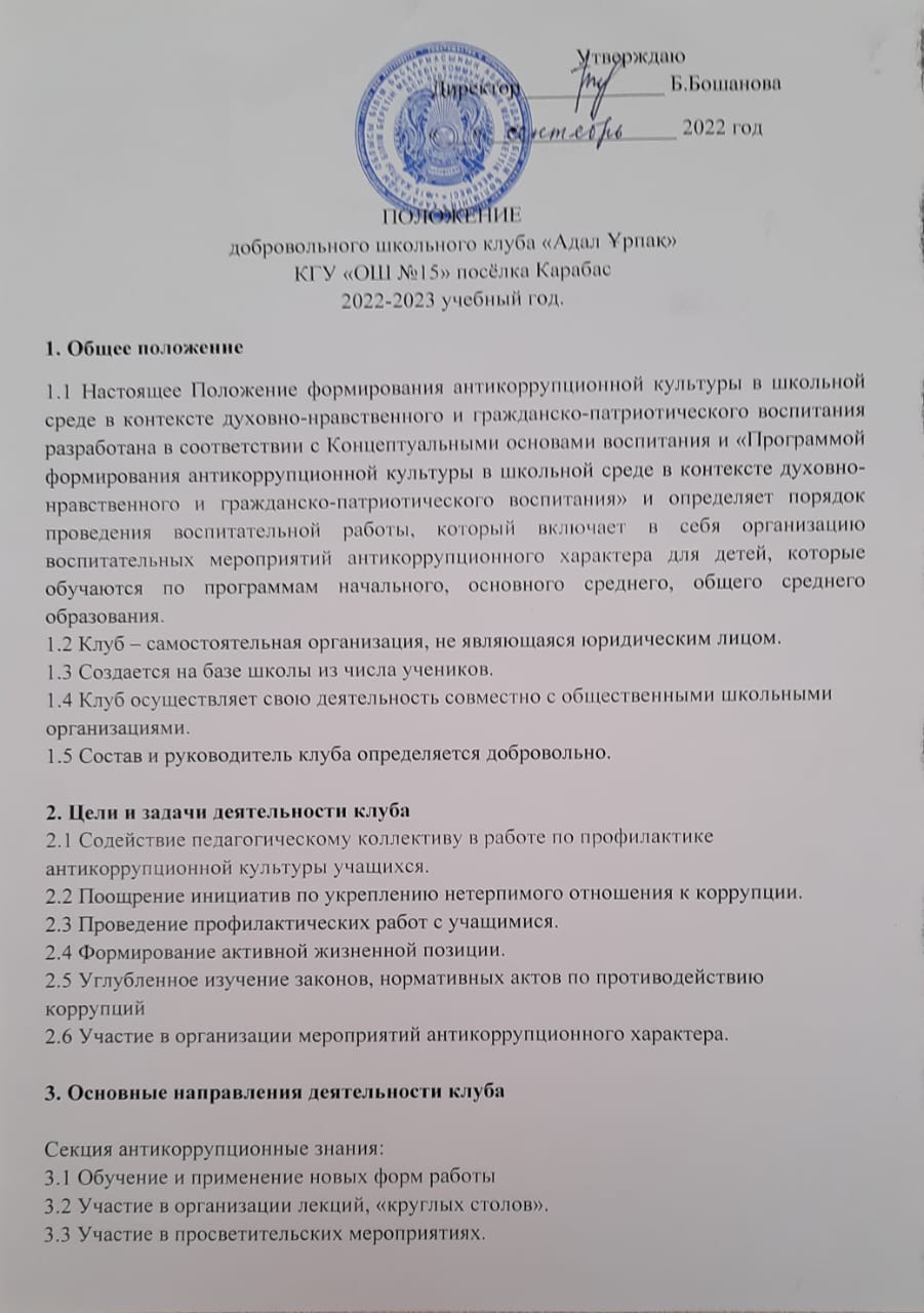 Положениедобровольный школьный клуб "Адал Ұрпақ" страница 1 |