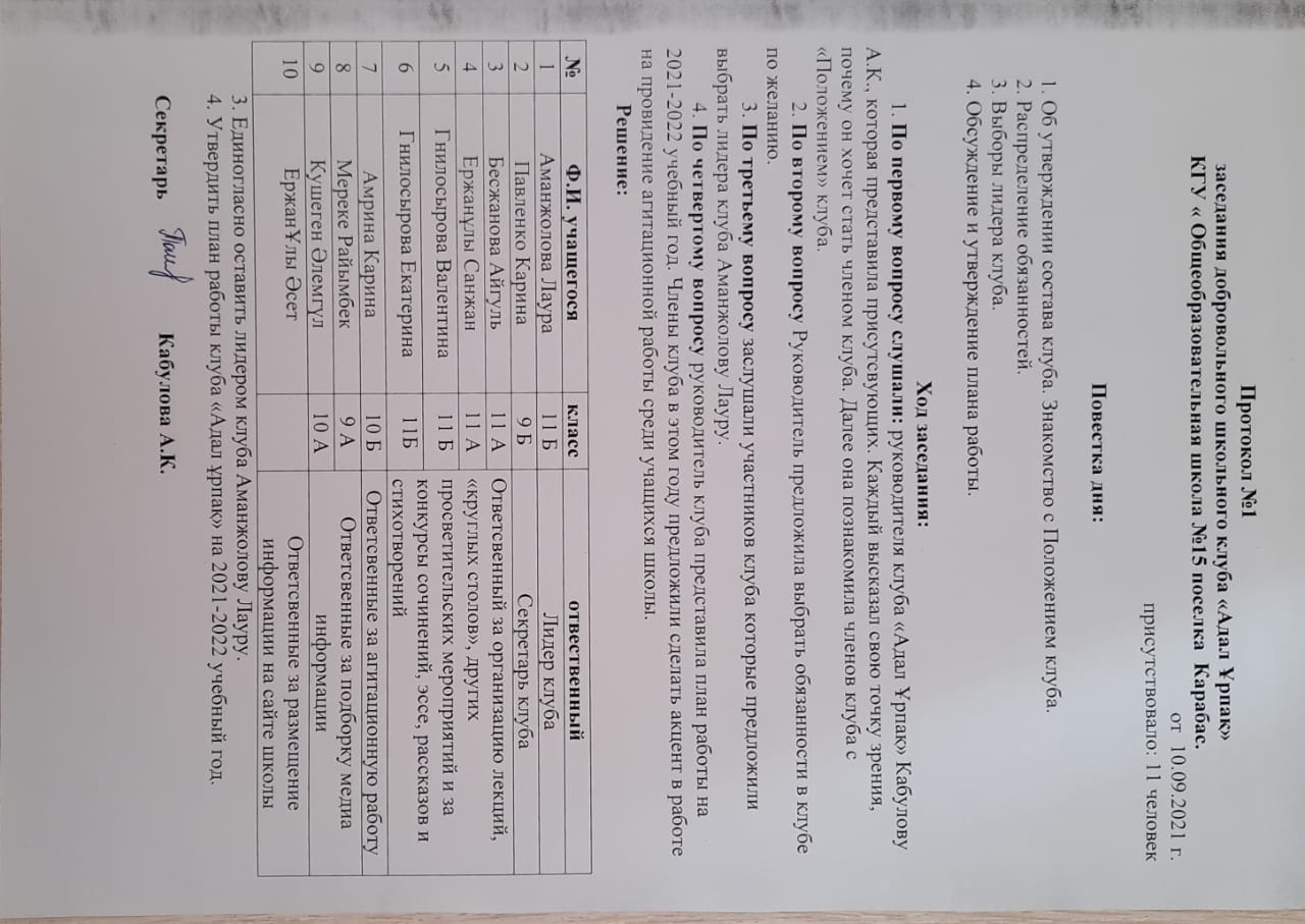 Протокол № 1Заседания добровольного школьного клуба "Адал Ұрпақ" |