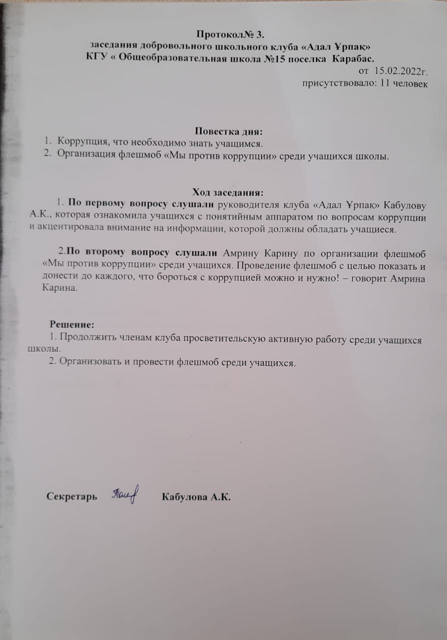 Протокол №3Заседания добровольного школьного клуба "Адал Ұрпақ" |