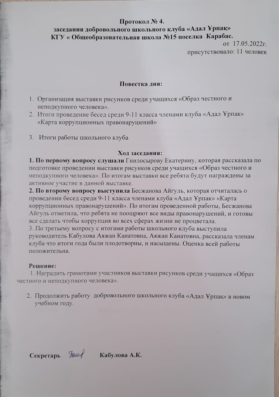 Протокол № 4Заседания добровольного школьного клуба "Адал Ұрпақ" |