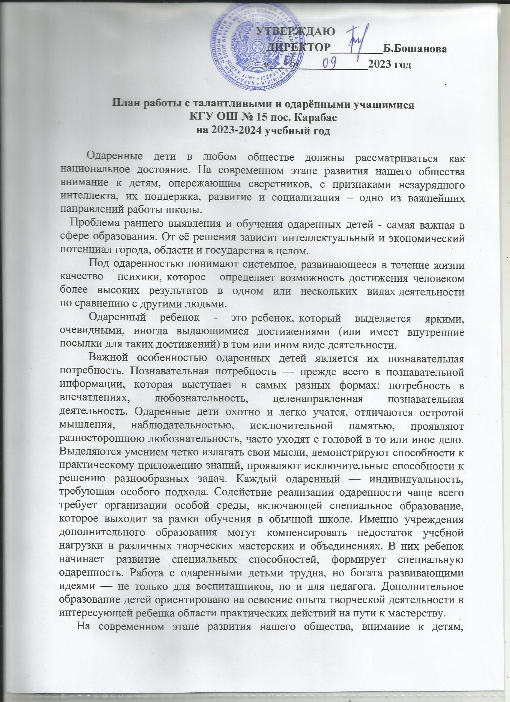 План работы с талантливыми и одаренными учащимися КГУ ОШ №15 на 2023-2024 учебный годПлан работы с одаренными детьми |