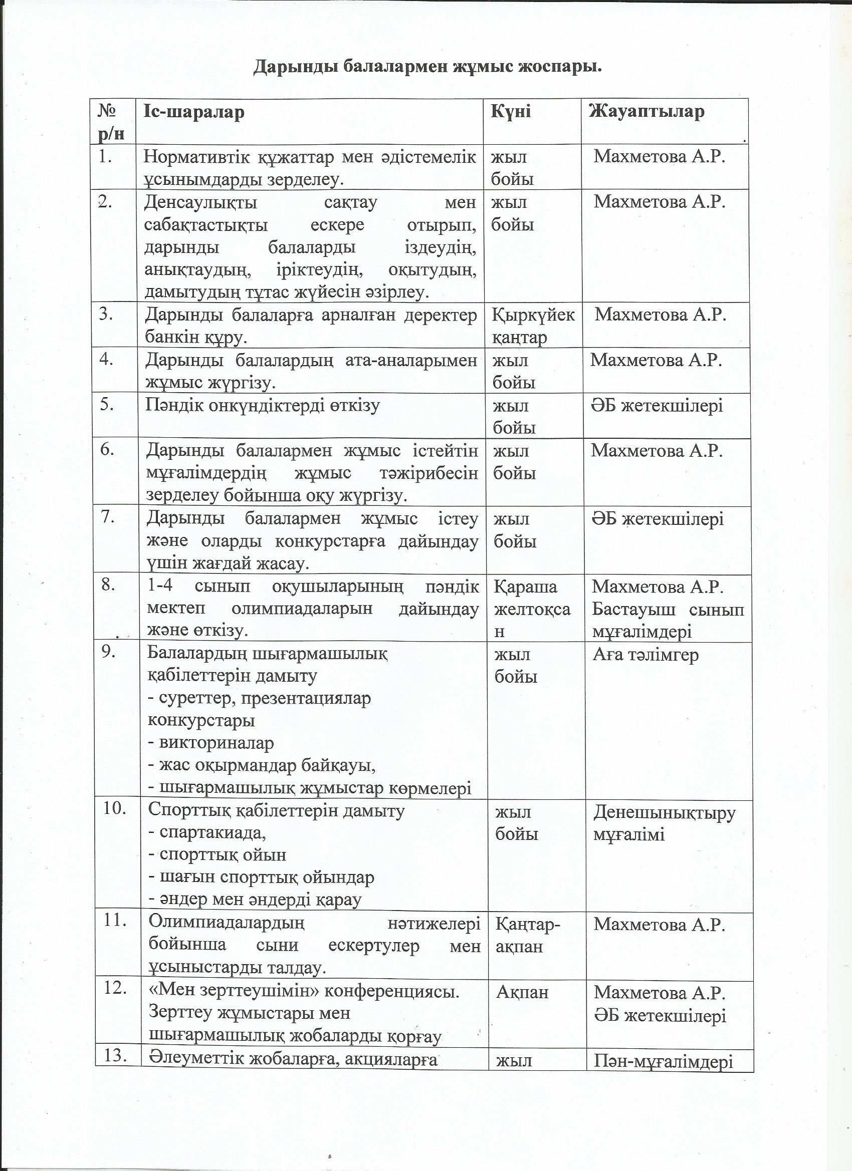 2023-2024 оқу жылына арналған Қарабас кентінің №15 ЖББМ КММ Талантты және дарынды оқушылармен жұмыс жоспарыДарынды балалармен жұмыс жоспары |