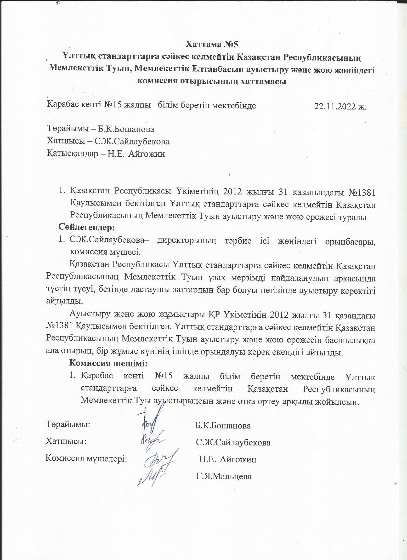 Ұлттық стандарттарға сәйкес келмейтін Қазақстан Республикасының Мемлекеттік Туын, Мемлекеттік Елтаңбасын ауыстыру және жою жөніндегі комиссия отырысының хаттамасы