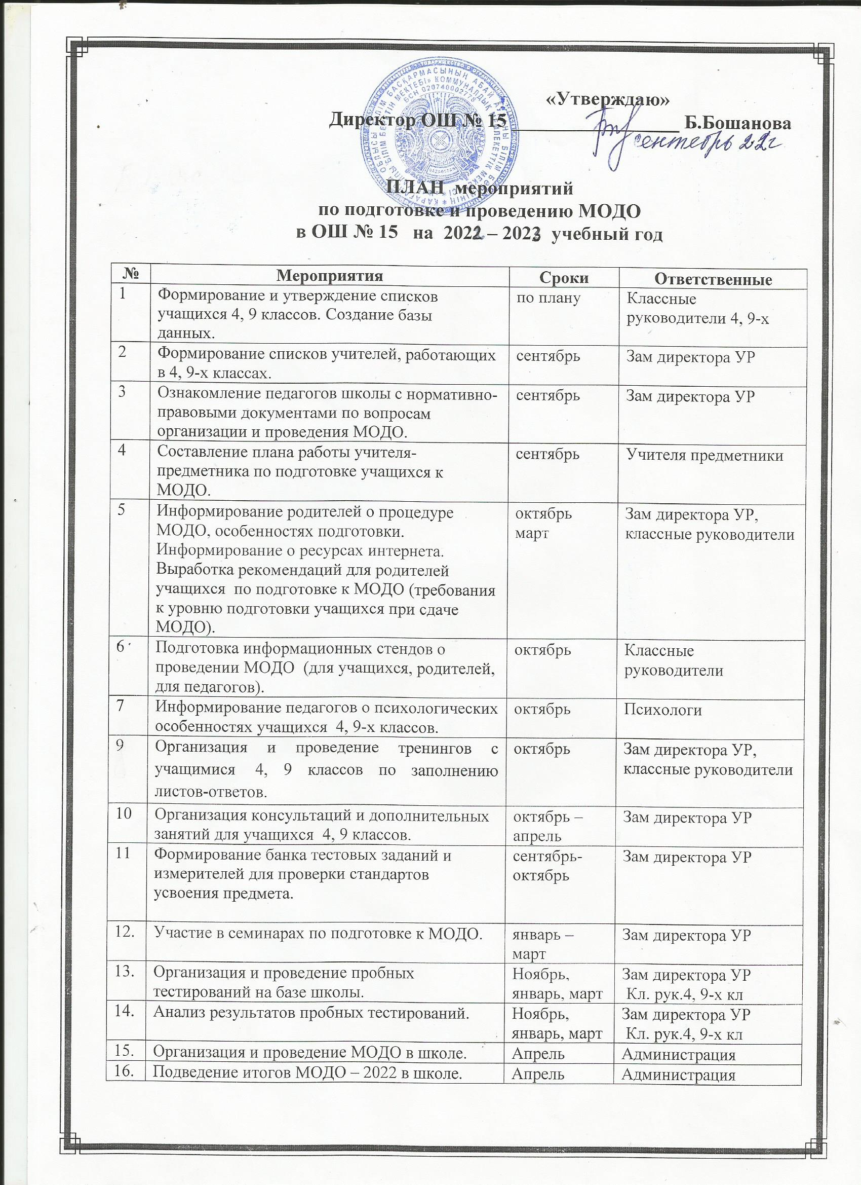 План мероприятийпо подготовке и проведению МОДО В ОШ № 15 на 2022-2023 учебный год |